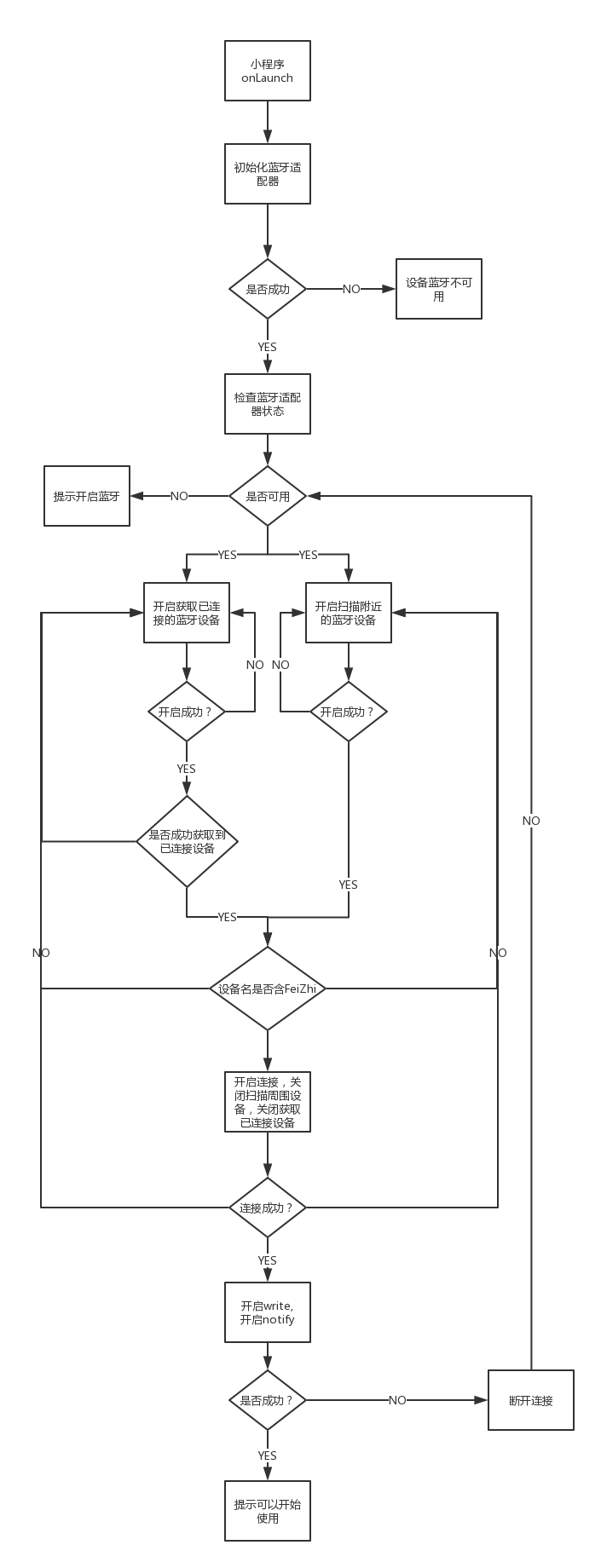 这个模块做了2周,找了很多资料文档,看示例看别人的demo,最后发现其实还是得靠自己,不吐槽了,开正文。 我实现的小程序模块自动连接(根据需要,可改手动),是在小程序初始化完成时开始自动调用执行。 大致流程: * 1、 开启蓝牙适配 ![]() 1、app.js的onLaunch() 方法里中调用开启连接 this.startConnect();弹出提示框,开启适配,如果失败提示设备蓝牙不可用,同时开启蓝牙适配器状态监听。 [JavaScript] 纯文本查看 复制代码 startConnect: function () { var that = this; wx.showLoading({ title: '开启蓝牙适配' }); wx.openBluetoothAdapter({ success: function (res) { console.log("初始化蓝牙适配器"); console.log(res); that.getBluetoothAdapterState(); }, fail: function (err) { console.log(err); wx.showToast({ title: '蓝牙初始化失败', icon: 'success', duration: 2000 }) setTimeout(function () { wx.hideToast() }, 2000) } }); wx.onBluetoothAdapterStateChange(function (res) { var available = res.available; if (available) { that.getBluetoothAdapterState(); } }) }2、初始化蓝牙适配器成功,调用this.getBluetoothAdapterState() 获取本机蓝牙适配器状态,判断是否可用,available为false则因为用户没有开启系统蓝牙。同时判断程序还没有开始搜索蓝牙设备,调用this.startBluetoothDevicesDiscovery();开始扫描附近的蓝牙设备,同时调用this.getConnectedBluetoothDevices() 开启获取本机已配对的蓝牙设备。 [JavaScript] 纯文本查看 复制代码 getBluetoothAdapterState: function () { var that = this; wx.getBluetoothAdapterState({ success: function (res) { var available = res.available, discovering = res.discovering; if (!available) { wx.showToast({ title: '设备无法开启蓝牙连接', icon: 'success', duration: 2000 }) setTimeout(function () { wx.hideToast() }, 2000) } else { if (!discovering) { that.startBluetoothDevicesDiscovery(); that.getConnectedBluetoothDevices(); } } } }) }3、开始搜索蓝牙设备startBluetoothDevicesDiscovery() , 提示蓝牙搜索。 [JavaScript] 纯文本查看 复制代码 startBluetoothDevicesDiscovery: function () { var that = this; wx.showLoading({ title: '蓝牙搜索' }); wx.startBluetoothDevicesDiscovery({ services: [], allowDuplicatesKey: false, success: function (res) { if (!res.isDiscovering) { that.getBluetoothAdapterState(); } else { that.onBluetoothDeviceFound(); } }, fail: function (err) { console.log(err); } }); }4、获取已配对的蓝牙设备。此方法特别说明参数services(Array)是必填的,但是官方示例中以及各种坑爹demo里从没见过有谁填写,但是不填写这个属性此方法无法获取到任何已配对设备。如果要调用此方法则是需要连接特定设备,并且知道该设备的一个主服务serviceId。如果未知可以先手动连接一次想要连接的设备,然后获取service列表,记录属性primary为true的值至少一个。 [JavaScript] 纯文本查看 复制代码 getConnectedBluetoothDevices: function () { var that = this; wx.getConnectedBluetoothDevices({ services: [that.serviceId], success: function (res) { console.log("获取处于连接状态的设备", res); var devices = res['devices'], flag = false, index = 0, conDevList = []; devices.forEach(function (value, index, array) { if (value['name'].indexOf('FeiZhi') != -1) { // 如果存在包含FeiZhi字段的设备 flag = true; index += 1; conDevList.push(value['deviceId']); that.deviceId = value['deviceId']; return; } }); if (flag) { this.connectDeviceIndex = 0; that.loopConnect(conDevList); } else { if (!this.getConnectedTimer) { that.getConnectedTimer = setTimeout(function () { that.getConnectedBluetoothDevices(); }, 5000); } } }, fail: function (err) { if (!this.getConnectedTimer) { that.getConnectedTimer = setTimeout(function () { that.getConnectedBluetoothDevices(); }, 5000); } } }); }5、开启蓝牙搜索功能失败,则回到第2步重新检查蓝牙是适配器是否可用,开启蓝牙搜索功能成功后开启发现附近蓝牙设备事件监听。this.onBluetoothDeviceFound() [JavaScript] 纯文本查看 复制代码 onBluetoothDeviceFound: function () { var that = this; console.log('onBluetoothDeviceFound'); wx.onBluetoothDeviceFound(function (res) { console.log('new device list has founded') console.log(res); if (res.devices[0]) { var name = res.devices[0]['name']; if (name != '') { if (name.indexOf('FeiZhi') != -1) { var deviceId = res.devices[0]['deviceId']; that.deviceId = deviceId; console.log(that.deviceId); that.startConnectDevices(); } } } }) }此方法可自定义过滤一些无效的蓝牙设备比如name为空的,个人产品开发中需要过滤devices name 不含有FeiZhi字符串的设备。 6、在第5步中发现了某个想配对的设备,则获取到该设备的deviceId,然后开始配对该设备 this.startConnectDevices()。 [JavaScript] 纯文本查看 复制代码 startConnectDevices: function (ltype, array) { var that = this; clearTimeout(that.getConnectedTimer); that.getConnectedTimer = null; clearTimeout(that.discoveryDevicesTimer); that.stopBluetoothDevicesDiscovery(); this.isConnectting = true; wx.createBLEConnection({ deviceId: that.deviceId, success: function (res) { if (res.errCode == 0) { setTimeout(function () { that.getService(that.deviceId); }, 5000) } }, fail: function (err) { console.log('连接失败:', err); if (ltype == 'loop') { that.connectDeviceIndex += 1; that.loopConnect(array); } else { that.startBluetoothDevicesDiscovery(); that.getConnectedBluetoothDevices(); } }, complete: function () { console.log('complete connect devices'); this.isConnectting = false; } }); }开启连接后为了避免出现冲突,一旦开启连接则终止扫描附近蓝牙设备,终止读取本机已配对设备。 7、连接成功后根据deiviceId获取设备的所有服务。this.getService(deviceId); [JavaScript] 纯文本查看 复制代码 getService: function (deviceId) { var that = this; // 监听蓝牙连