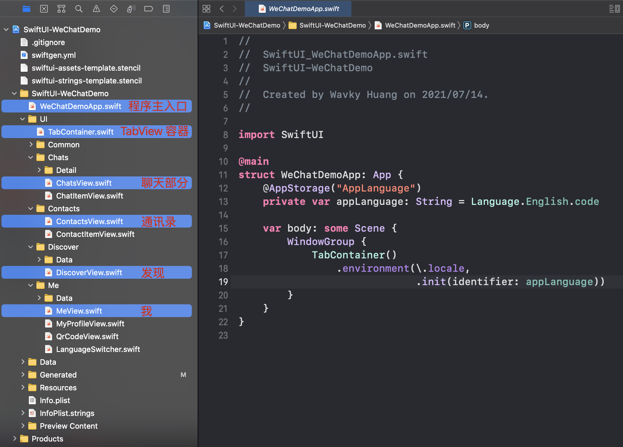 前置资源GitHub: SwiftUI-WeChatDemo 第零章:用 SwiftUI 5天组装一个微信 第二章:剖析:如何用 SwiftUI 5天组装一个微信 —— 通讯录发现我篇 ![]() 整体结构![]() UI 部分的代码分布如上图所示,App 的主入口类为 WeChatDemoApp。 该类在创建新的 SwiftUI 项目时会自动生成,这里只需要将其展示内容的部分变更为第一级容器:TabContainer,该容器包括微信的四个页面,分别为 聊天界面部分、通讯录、发现、我,这四个部分的主 UI 视图分布如上图标示,由各自的分级文件夹装载,并统合到主目录 UI 下面。 与 UI 目录同级目录有: