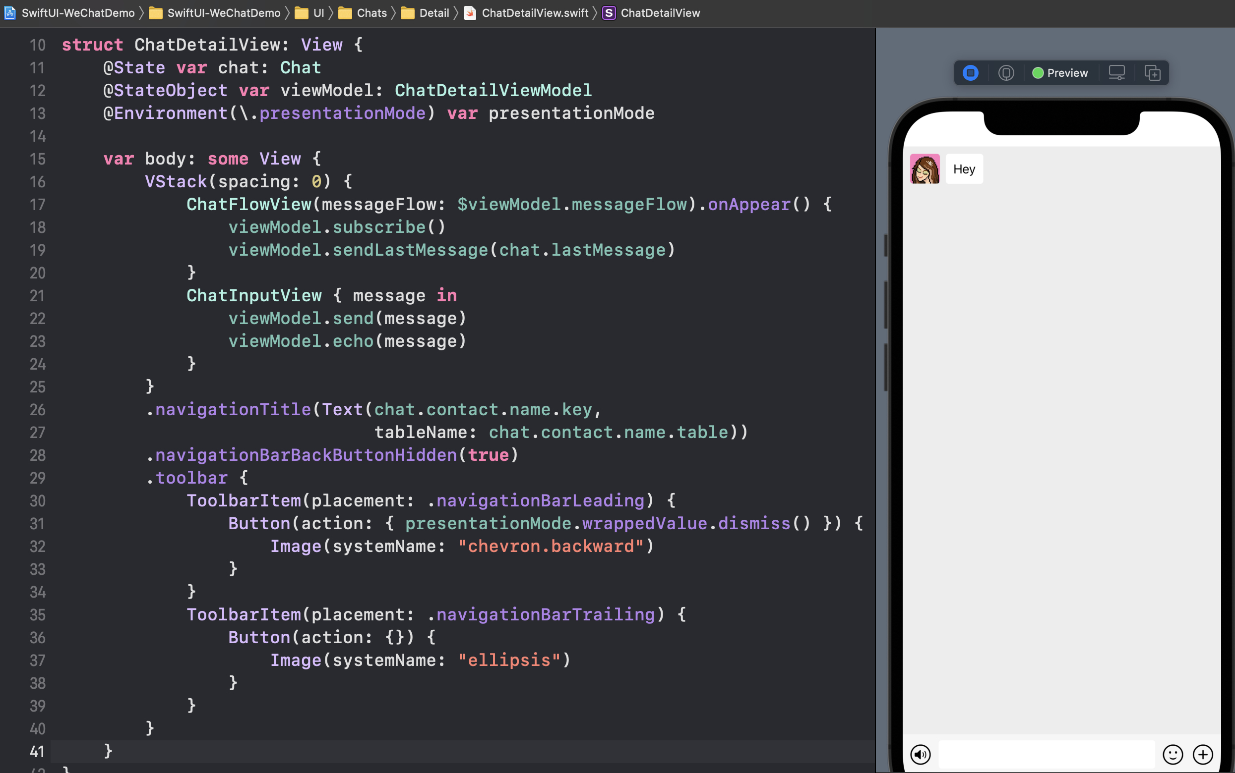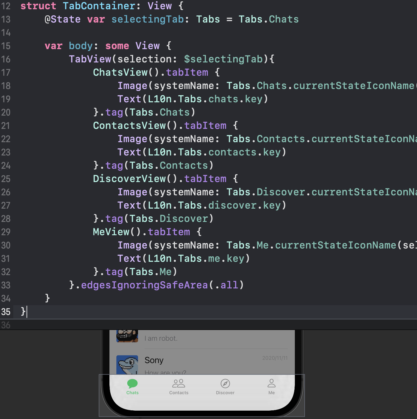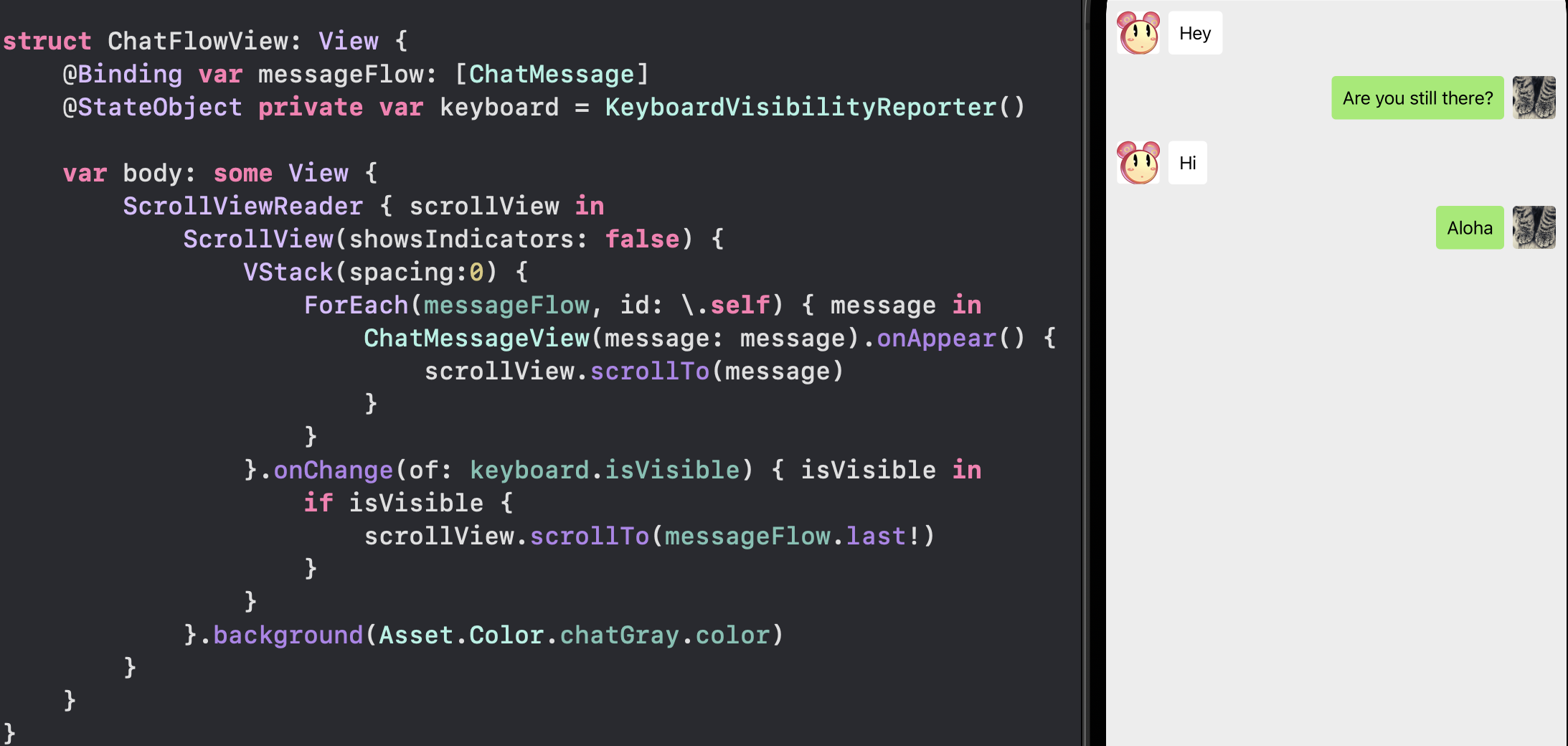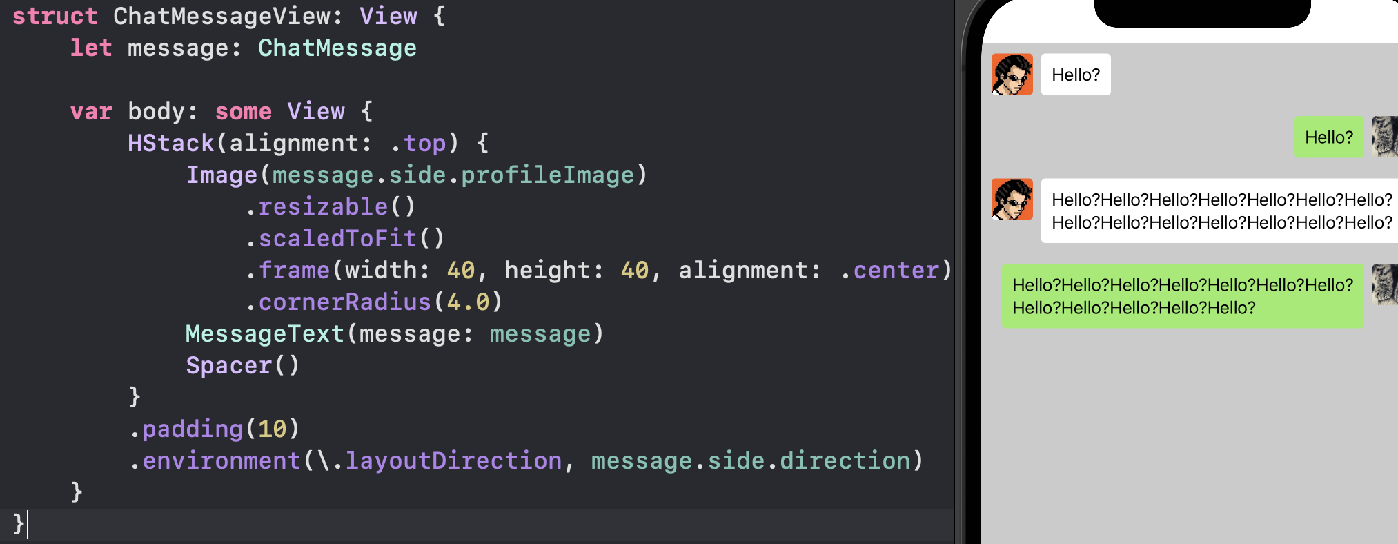 ChatFlowView 根据由 ViewModel 所托管的消息记录 messageFlow 数组数据,使用 ForEach 生成每一条对话消息: ![]() ScrollViewReader 用于提供对 ScrollView 的滑动控制能力,在不需要程序自动控制 ScrollView 滑动时,则不需要使用该部件。 ChatMessageView 表示头像+信息组成的一条聊天信息,使用一个 ChatMessage 类型的数据进行初始化,数据包含聊天信息内容的 String,以及发送方向、头像。 ![]() 其中的 MessageText 基本上是一个普通 Text,展示 ChatMessage 中的信息内容,并根据其中的发送方向(左侧或是右侧)决定 Text 的底色。 在外层 HStack 上通过改写局部环境变量 layoutDirection,来实现布局排序方向变化。 免责声明:如果侵犯了您的权益,请联系站长,我们会及时删除侵权内容,谢谢合作! |