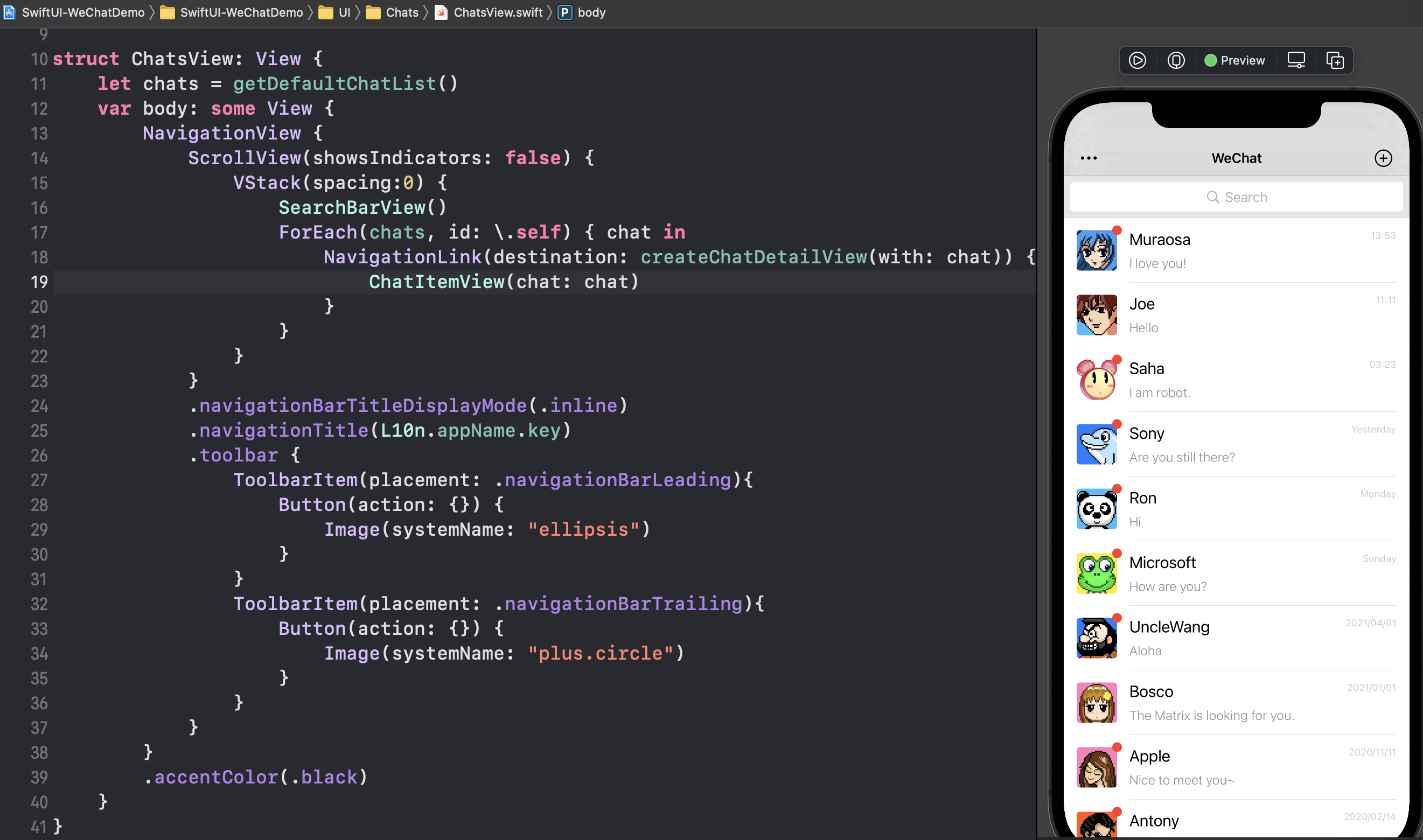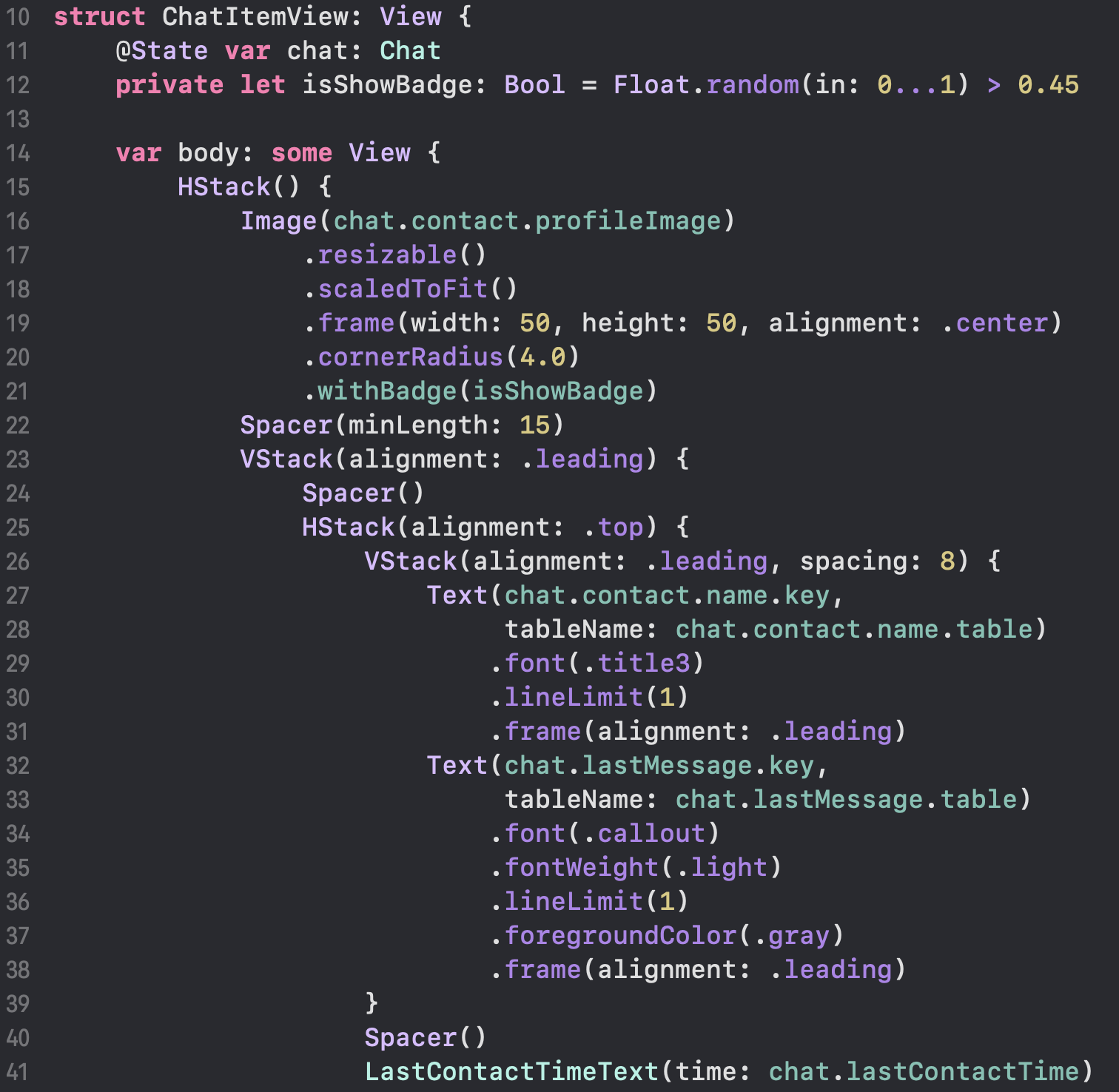 此处 上述代码中,ForEach 根据 Chat 数组,生成聊天列表中每一个聊天记录项的 View,该 View 由 NavigationLink 所包裹,当用户点击该 View 时,将自动通过外层的 NavigationView 进行页面导航,跳转至此处指定的 destination 指向的 View(作为子页布局展示)。 同时,NavigationView 会为该子页面添加一个 Toolbar,以及一个用于返回的箭头按钮。 而 这些部分描述当前界面的顶部的 Title 展示形式、标题文本、Toolbar构成等。 需要注意的是这部分描述需要在 NavigationView 内的 View 上书写,而不是附加在 NavigationView 自身上。 聊天列表记录 ItemView![]() 聊天列表上的记录 Item View: ![]() Spacer 是一个可以依据剩余可用空间自动填充扩展的结构,用于自动撑开两个 View 或将容器撑满整个屏幕等。 头像部分,显示一个图片素材,指定其可缩放至指定 frame 大小,并追加圆角角度: