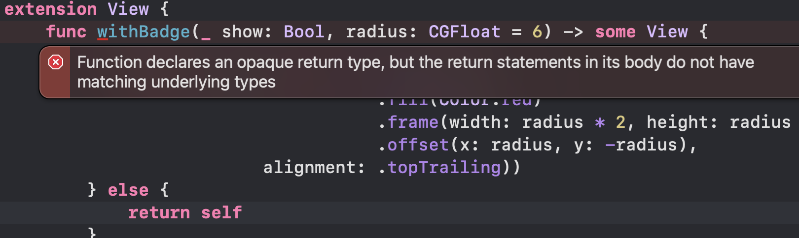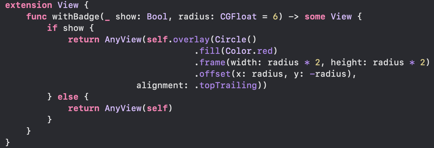 最后的 ![]() 该函数通过为 View 添加一个圆形的 overlay,指定放置在右上角并偏移一半尺寸到 View 外侧,来实现信息红点功能。 函数返回类型指定为