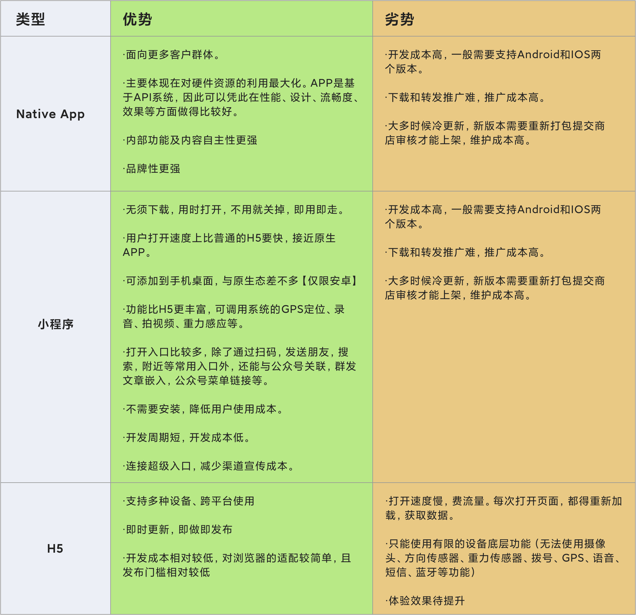 Native APP(原生APP)、小程序、H5的优劣对比: