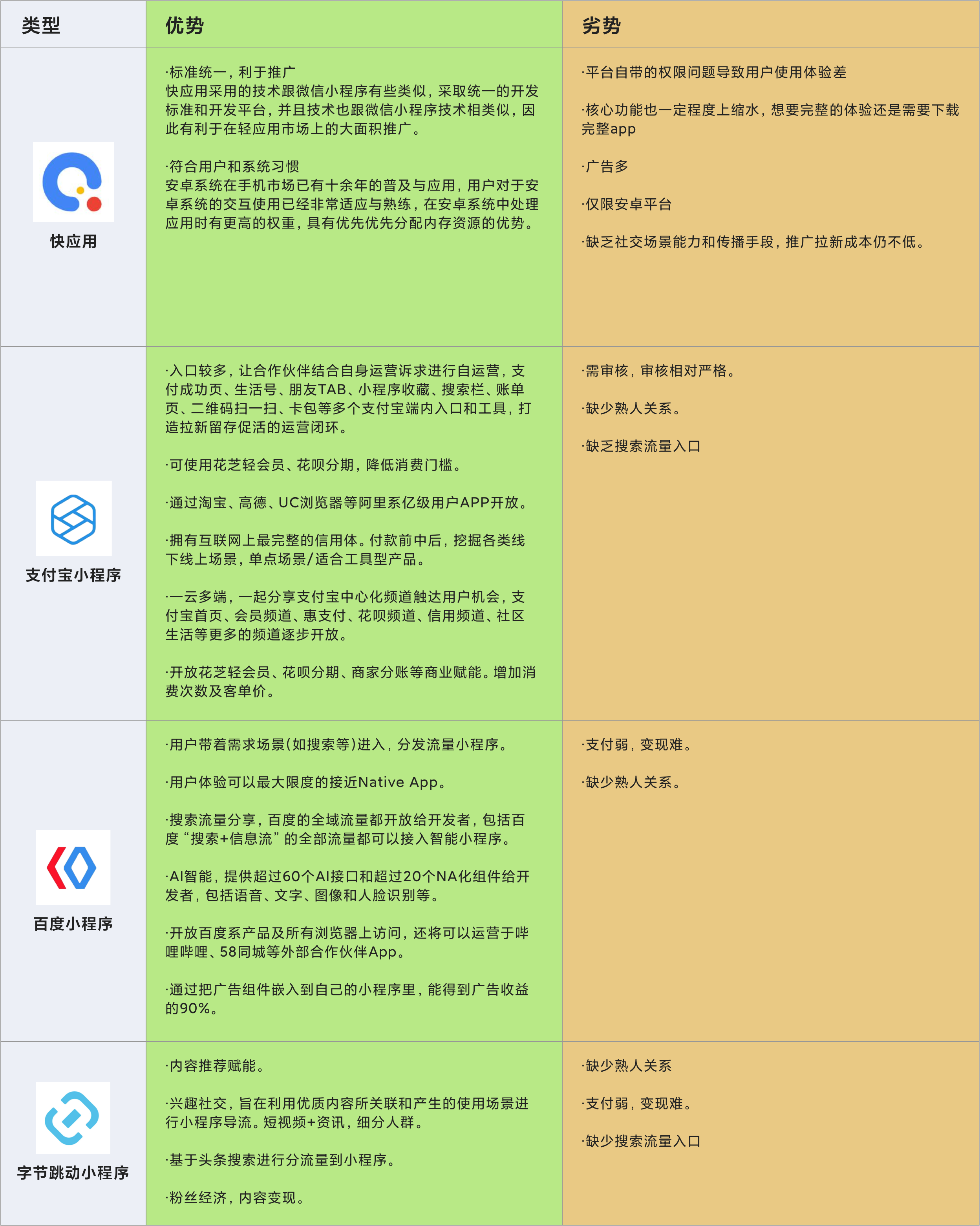快应用、支付宝小程序、百度小程序、头条抖音小程序优劣对比:
