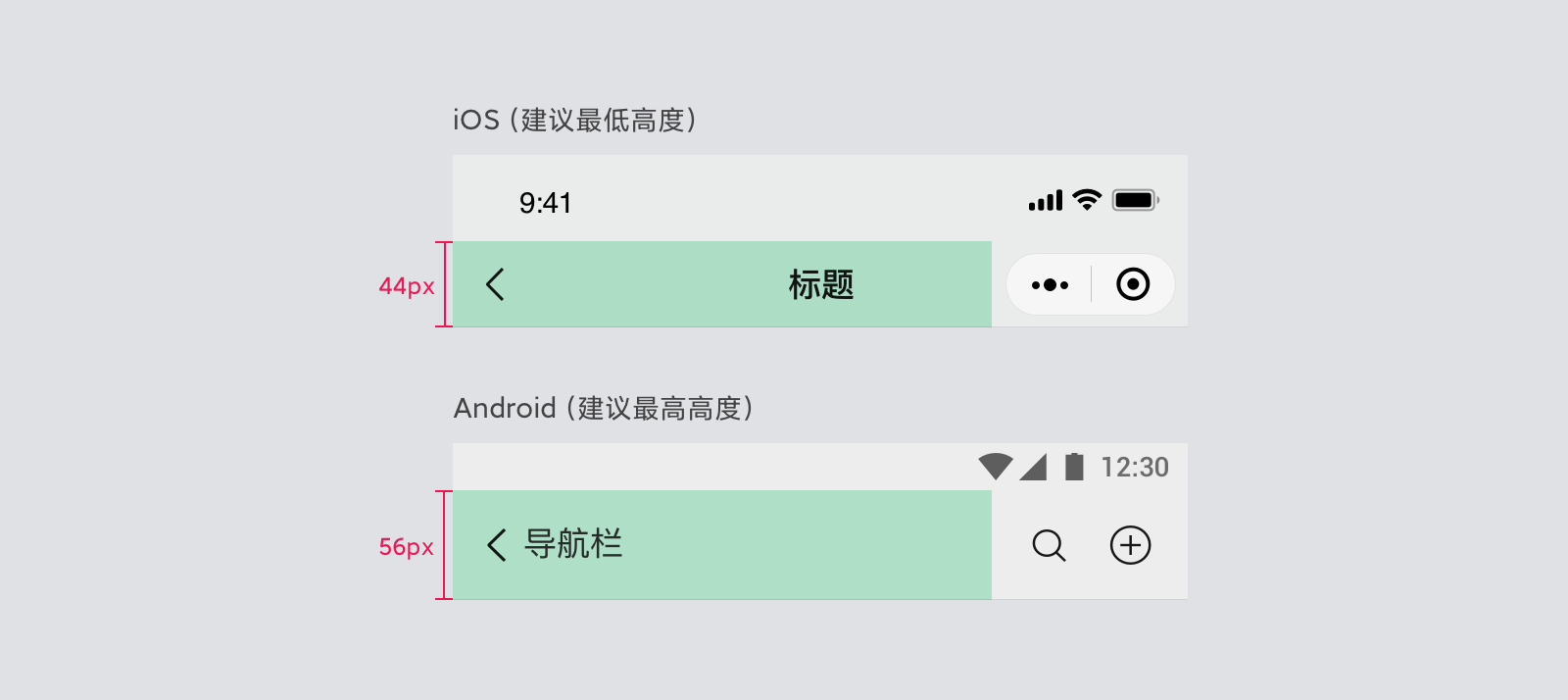 下面从颜色、样式、布局等方面详细介绍下导航栏。 4.3.1 导航栏高度官方给的数据是iOS系统44dp,Android系统56dp。也就是适用区间建议44dp-56dp为宜,这个可根据实际情况进行调整。