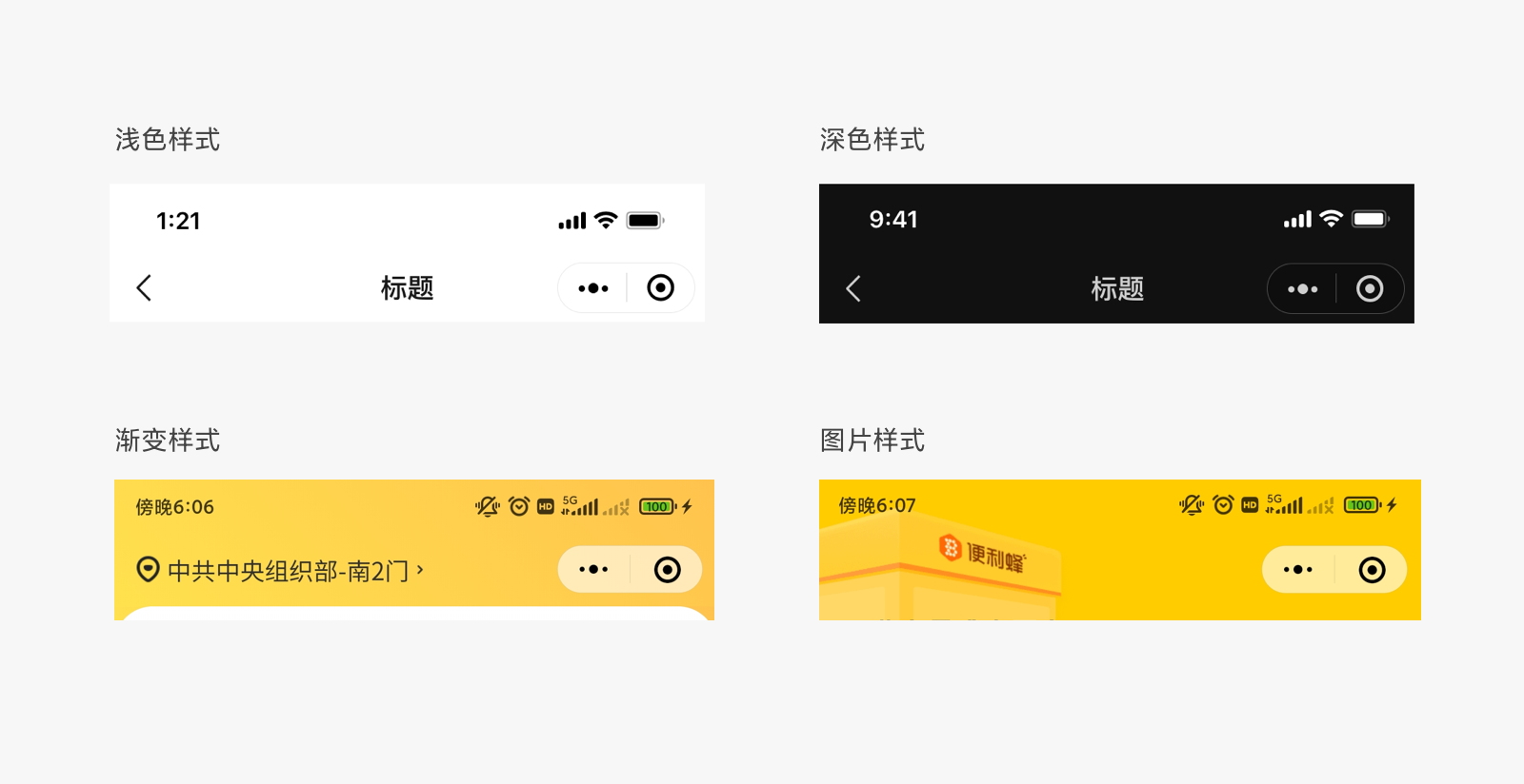 4.3.3 导航栏的颜色。导航栏颜色是完全可以自定义的,既可以定义为纯色又可以定义为渐变,也可以定义为背景图片。不过对应的,导航栏的文案和icon以及小程序胶囊的颜色也要根据情况不同进行适当的色值调整,以保证信息良好的阅读性。