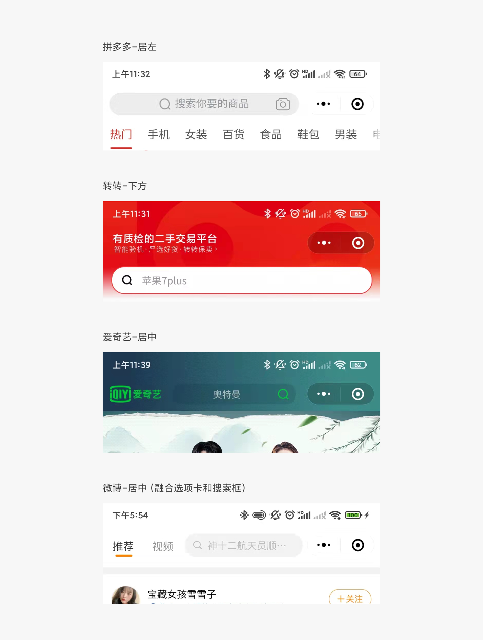 居左和居中会使页面布局更加紧凑,让屏幕纵向空间展示更多内容,如拼多多小程序、爱奇艺小程序、微博小程序;而居下则可以重点突出搜索功能,如转转小程序。三种方式没有明显的优劣之分,可根据产品的具体情况具体选择。