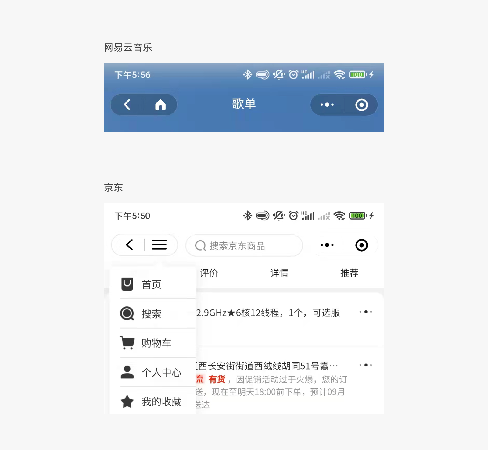 例如网易云音乐小程序,如果页面经过多次跳转后页面层级较深,这时如果想回到首页,就不需要一步步返回,直接点击回到首页的icon就可以了,一定程度上简化了操作。而京东小程序,则加了一个下拉抽屉,抽屉里承载了更多的快捷跳转入口。