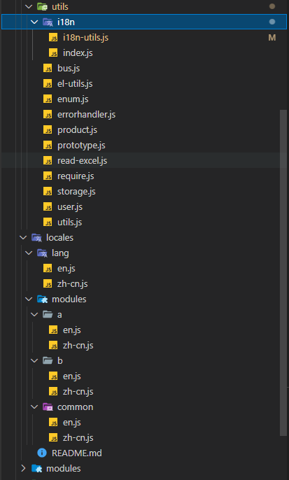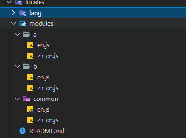 以后每增加一种文件,则只需要在lang文件夹里面构建类似的内容即可。因为懒,其实这个也可以再进一步封装,不需要每增加一种语言就重复差不多的代码。不过就是需要提前将所有element-plus支持的语言引用先定义好。思路就是构建一个map对象。然后动态引入。 接下来我们看locales/modules各模块的内容