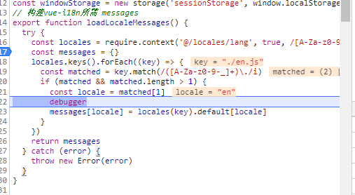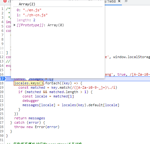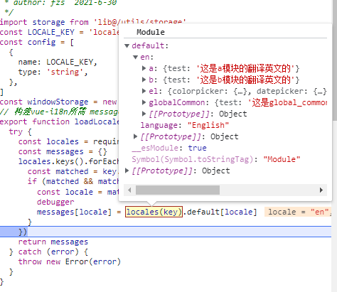 我们主要来看loadLocaleMessages函数,此函数就是为了解决已经将语言文件拆分不同的语言文件再统一引入。主要是借助 require.context这个方法.统一引入所有语言文件。动态构建vue-i18n需要的message 不了解的可以点击了解 打断点让大家看看里面各值,帮助大家理解