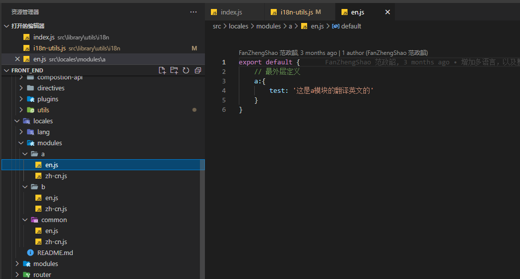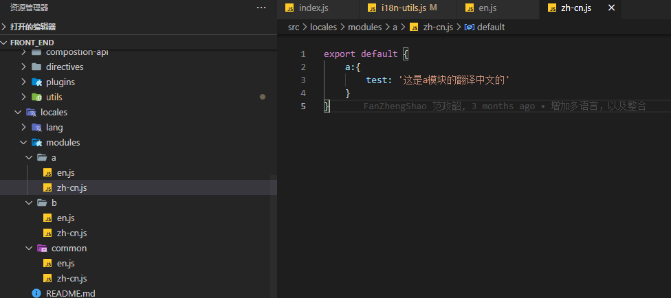 export default { // 最外层定义 a则为模块名称 a:{ test: '这是a模块的翻译英文的' }}