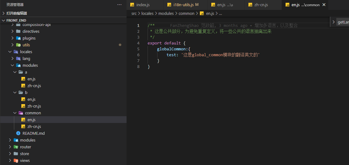 接下来我们再看 locales目录里面的内容 lang目录下(兼容element-plus,并构建message): 1.en.js /** * author: fzs 2021-6-30 */import enLocale from 'element-plus/lib/locale/lang/en'import {getLangObjBylocaleName} from 'lib@/utils/i18n/i18n-utils'export default { language:'English', // 必须 [enLocale.name]: { // el 这个属性很关键,一定要保证有这个属性, el: enLocale.el, // 定义您自己的字典,但是请不要和 `el` 重复,这样会导致 ElementPlus 内部组件的翻译失效. ...getLangObjBylocaleName(enLocale.name) },}