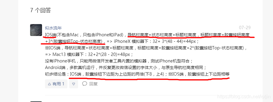 注意:在获取胶囊按钮样式信息中发现,iOS上获取的数据异常,然后通过异常的胶囊按钮数据算出的导航条高度不对。熟悉iOS的应该知道,iOS设备的状态栏的高度为:20(非刘海屏)或 44(刘海屏),标题栏高度为:44。因此暂时判断如果是iOS设备,把标题栏高度直接设置为 44,其他端还按照下面计算方式计算: 导航条高度 = 状态栏高度 + ( 标题栏高度=胶囊按钮高度+(胶囊按钮Top-状态栏高度)*2 )
