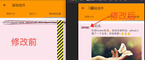 处理方式:修改及添加默认图ClipRRect( borderRadius: BorderRadius.circular(25), // child: Container( // color: Color(0xF4F4F4), // alignment: Alignment.center, // height: 50, // width: 50, // child: Image.network( // "https://i02piccdn.sogoucdn.com/c7890fba1b75cdd6", // width: 30, // height: 30, // ), // ) //色值默认图 child: Container( alignment: Alignment.center, height: 50, width: 50, child: FadeInImage.assetNetwork( // this.data.userImgUrl, placeholder: "assets/pics/share_place.png", image: "https://xxxx", width: 50, height: 50, fit: BoxFit.scaleDown, imageErrorBuilder: (context, error, stackTrace) { return Image.asset("assets/pics/share_place.png"); }, ), )),