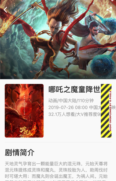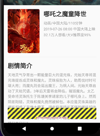 处理方式:用SingleChildScrollView包裹一下实现页面滑动需要用到SingleChildScrollView组件,SingleChildScrollView和Android中ScrollView类似 class FilmContent extends StatelessWidget { @override Widget build(BuildContext context) { return Padding( padding: const EdgeInsets.all(16), child: SingleChildScrollView( physics: BouncingScrollPhysics(), child: Column( crossAxisAlignment: CrossAxisAlignment.start, children: [ Row( crossAxisAlignment: CrossAxisAlignment.start, children: [ ClipRRect( borderRadius: BorderRadius.circular(6), child: Container( alignment: Alignment.center, height: 180, width: 130, child: Image.network( 'https://img1.gamersky.com/image2019/07/20190725_ll_red_136_2/gamersky_07small_14_201972510258D0.jpg', width: 130, height: 180, fit: BoxFit.cover, ), ), ), Padding(padding: EdgeInsets.only(left: 16)), Expanded( child: Column( crossAxisAlignment: CrossAxisAlignment.start, children: [ Text( '哪吒之魔童降世', style: TextStyle( fontSize: 25, fontWeight: FontWeight.bold, color: Color(0xFF333333), ), ), Padding(padding: EdgeInsets.only(top: 10)), Text( '动画/中国大陆/110分钟', style: TextStyle( fontSize: 15, color: Color(0xFF999999), ), ), Padding(padding: EdgeInsets.only(top: 2)), Text( '2019-07-26 08:00 中国大陆上映', style: TextStyle( fontSize: 15, color: Color(0xFF999999), ), ), Padding(padding: EdgeInsets.only(top: 2)), Text( '32.1万人想看/大V推荐度95%', style: TextStyle( fontSize: 15, color: Color(0xFF999999), ), ), ], ), ) ], ), Divider(height: 32), Column( crossAxisAlignment: CrossAxisAlignment.start, children: [ Text( '剧情简介', style: TextStyle( fontSize: 25, fontWeight: FontWeight.bold, color: Color(0xFF333333), ), ), Padding(padding: EdgeInsets.only(top: 10)), Text( '天地灵气孕育出一颗能量巨大的混元珠,元始天尊将混元珠提炼成灵珠和魔丸,灵珠投胎为人,助周伐纣时可堪大用;而魔丸则会诞出魔王,为祸人间。元始天尊启动了天劫咒语,3年后天雷将会降临,摧毁魔丸。太乙受命将灵珠托生于陈塘关李靖家的儿子哪吒身上。然而阴差阳错,灵珠和魔丸竟然被掉包。本应是灵珠英雄的哪吒却成了混世大魔王。调皮捣蛋顽劣不堪的哪吒却徒有一颗做英雄的心。然而面对众人对魔丸的误解和即将来临的天雷的降临,哪吒是否命中注定会立地成魔?他将何去何从?', textAlign: TextAlign.justify, style: TextStyle( fontSize: 15, color: Color(0xFF999999), ), ), ], ), ], ), ) ); }}