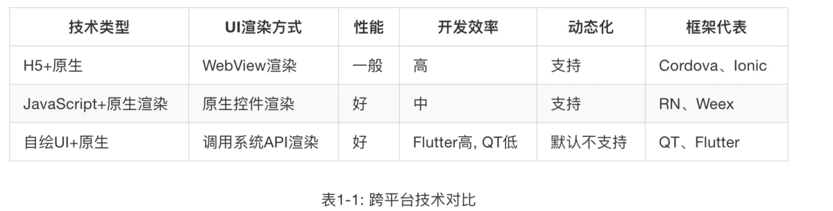 至此,React Native 便实现了跨平台。 相对于混合应用,由于React Native是原生控件渲染,所以性能会比混合应用中H5好很多,同时React Native使用了Web开发技术栈,也只需维护一份代码,同样是跨平台框架。 FLutterFlutter是谷歌的移动UI框架,可以快速在iOS和Android上构建高质量的原生用户界面。 Flutter可以与现有的代码一起工作。在全世界,Flutter正在被越来越多的开发者和组织使用,并且Flutter是完全免费、开源的。 总体来说,相比于React Native框架,Flutter的优势最主要体验在性能、开发效率和体验两大方面。 React Native所使用的JavaScriptCore,原本用在浏览器中,用于解释执行网页中的JavaScript代码。为了兼容Web标准留下来的历史包袱,无法专门针对移动端进行性能优化。Flutter却不一样,它一开始就抛弃了历史包袱,使用全新的Dart语言编写,同时支持AOT和JIT两种编译方式,而没有采用HTML/CSS/JavaScript组合方式开发,在执行效率上明显高于JavaScriptCore。 除了编程语言的虚拟机,Flutter的优势还体现于UI框架的实现上。它重写了UI框架,从UI控件到渲染,全部重写实现了,依赖Skia图形库和系统图形绘制相关的接口,保证了不同平台上能有相同的体验。 Flutter 在业务层面的发展阻力Flutter 多端一致性上表现良好,能做到所见即所得,无需针对某一平台做额外适配工作;性能流畅度提升,相较于 H5 版本首屏时间有较大提升。