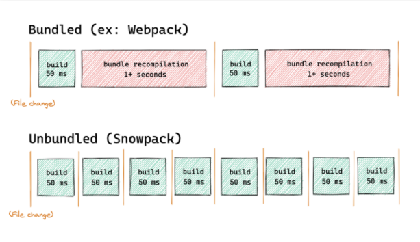 Webpack 等传统的构建式打包工具,在冷启动开发服务器时,首先都会将我们的整个代码库中的源代码和node_modules进行转换、编译(Babel、PostCSS...)和打包,最终将打包好的文件推送到我们的浏览器。 vite、snowpack这类非构建式打包工具,在冷启动开发服务器时,无需分析模块依赖,也不需要编译,通过ES Module 自动向依赖的资源发出请求,因此启动速度非常快。当浏览器请求某个模块时,再根据需要对模块内容进行编译。这种按需动态编译的方式,极大的缩减了编译时间,项目越复杂、模块越多,非构建式打包工具的优势越明显。 ![]()