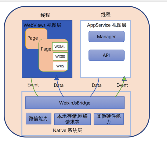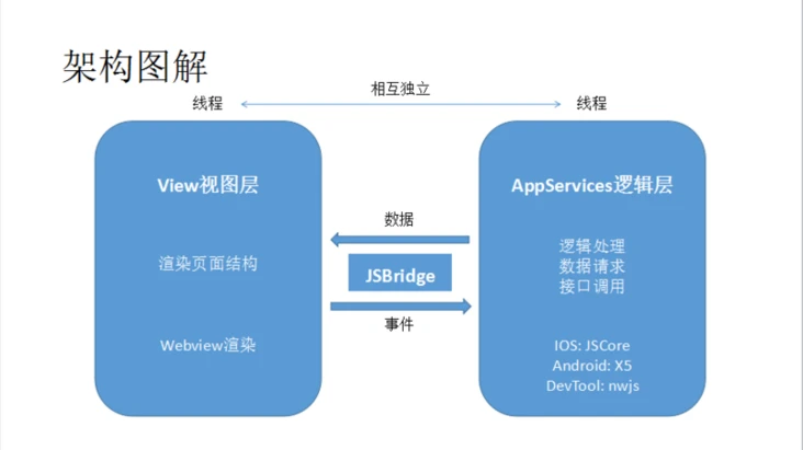 二、双线程模型小程序的渲染层和逻辑层分别由2个线程管理:视图层的界面使用了webview进行渲染,逻辑层采用JsCore线程运行js脚本。视图层和逻辑层通过系统层WeiXinJsBridge进行通信,逻辑层把数据变化通知到视图层,触发视图层的页面更新,视图层把触发的事件通知到逻辑层进行业务处理。