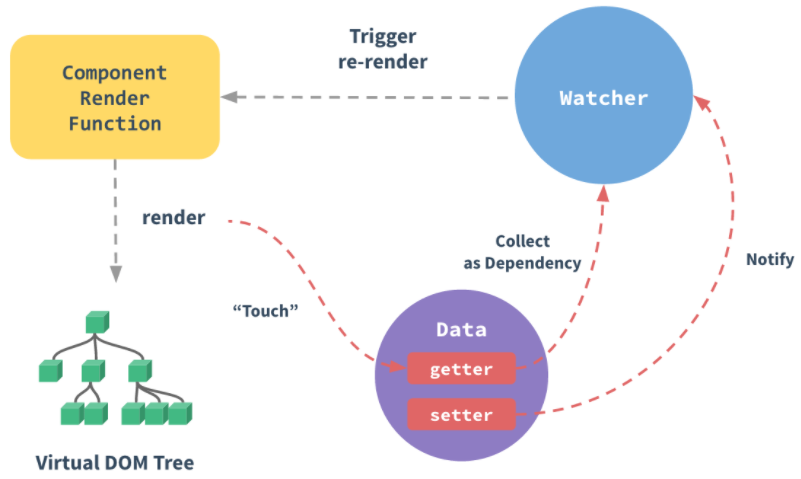 1.如何追踪数据变化当把一个普通的 JavaScript 对象传入 Vue 实例作为 data 选项,Vue 将遍历此对象所有的 property,并使用 Object.defineProperty把这些 property 全部转为 getter/setter。 这些 getter/setter 对用户来说是不可见的,但是在内部它们让 Vue 能够追踪依赖,在 property 被访问和修改时通知变更。 每个组件实例都对应一个 watcher 实例,它会在组件渲染的过程中把“接触”过的数据 property 记录为依赖。之后当依赖项的 setter 触发时,会通知 watcher,从而使它关联的组件重新渲染。