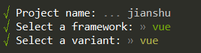 之后会让你输入项目名称,选择框架等。这里我们输入名称为jianshu,框架选择vue,回车然后进入项目中,输入yarn回车,安装依赖cd jianshu && yarn