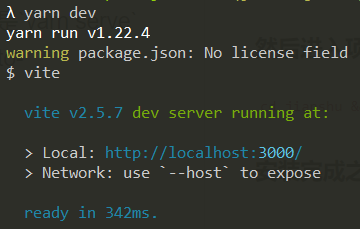 安装完成之后,使用yarn dev命令启动开发服务。可以看到只花了477毫秒就启动完成了,对比vue-cli来说快了很多。我们看到vite默认端口是3000,而不是8080,这个可以在项目里配置。打开localhost:3000地址,可以看到vite默认的欢迎页面。2、安装我们需要用到的插件网络请求使用axios,css预处理使用sass,还有登录验证会用到的jd-md5加密,当然还有我们的element-plus,最后就是vue全家桶:vuex和vue-router。yarn add axios sass js-md5 element-plus