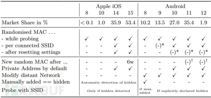 每个操作系统版本上与 WiFi 探测相关的隐私功能