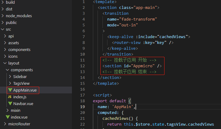 3、页面节点挂载在主内容区域(AppMain.vue)挂载子应用