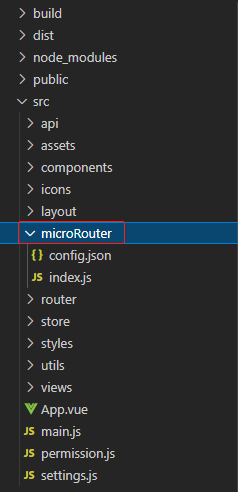 2、配置子应用路由文件导入子应用路由配置文件至src目录下,复制microRouter文件夹到src目录下,需要根据自己的项目做些更改。 下载地址:基座路由文件microRouter microRouter->config.json代码如下: { "development": { "VUE_ELEMENTUI_ADMIN": "//localhost:8098", "VUE_SON_APP":"//localhost:8098, "TAMIL_APP":"//localhost:8098" }, "production": { "VUE_ELEMENTUI_ADMIN": "//localhost:8098", "VUE_SON_APP":"//localhost:8098", "TAMIL_APP":"//localhost:8098" }}