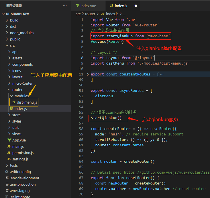 子应用路由(src\router\modules\dist-menu.js)设置具体借鉴apps-menu.js。 对应的基座当中设置的子应用名称,子应用路由配置必须与配置的microRouter.js当中的“name“对应起来。