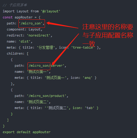 microRouter->index.js文件内容的name与activeRule的名称必须一致,代码如下: // 配置子应用访问地址import envConfig from './config.json'// 使用 NODE_ENV 区分不同环境,默认值为 const ENV = process.env.NODE_ENV || 'development'developmentconst config = envConfig[ENV]const { VUE_SON_APP} = configexport default [ /** * name: 微应用名称 - 具有唯一性,为了方便区分,采取和子应用名称 * entry: 微应用入口 - 通过该地址加载微应用 * container: 微应用挂载节点 - 微应用加载完成后将挂载在该节点上 * activeRule: 微应用触发的路由规则 - 触发路由规则后将加载该微应用 */ { name: 'micro_son', entry: VUE_SON_APP, container: '#Appmicro', activeRule: '#/micro_son' }]