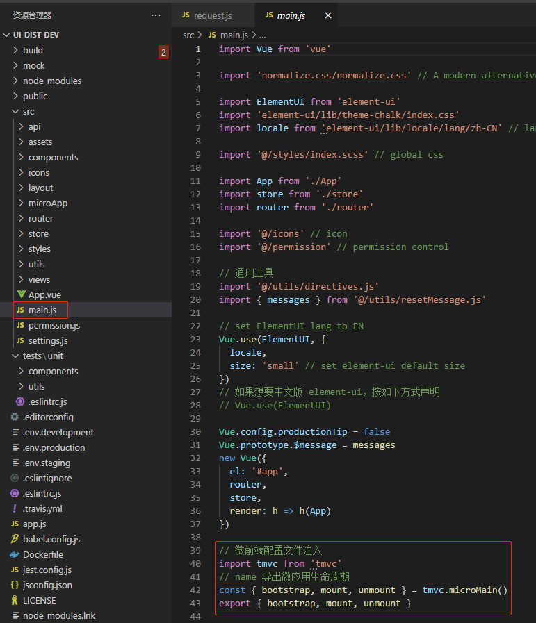 或是直接在package.json添加"tmvc": "1.0.16" 2、main.js 配置在main.js文件中引入tmvc, 并且导出微应用生命周期,具体代码如下:
