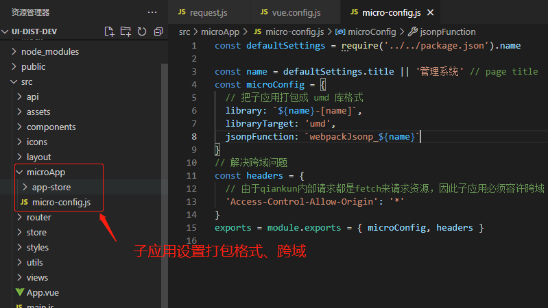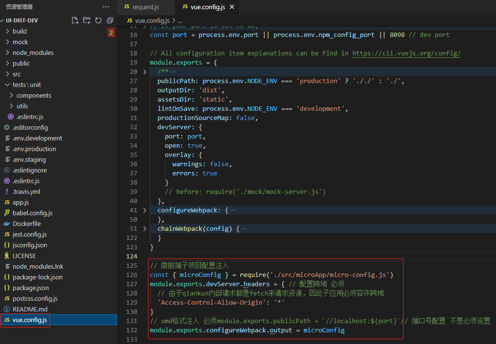 // 微前端子项目配置注入const { microConfig } = require('./src/microApp/micro-config.js')module.exports.devServer.headers = { // 配置跨域 必须 // 由于qiankun内部请求都是fetch来请求资源,因此子应用必须容许跨域 'Access-Control-Allow-Origin': '*'}// umd格式注入 必须module.exports.publicPath = `//localhost:${port}`// 端口号配置 不是必须设置module.exports.configureWebpack.output = microConfig