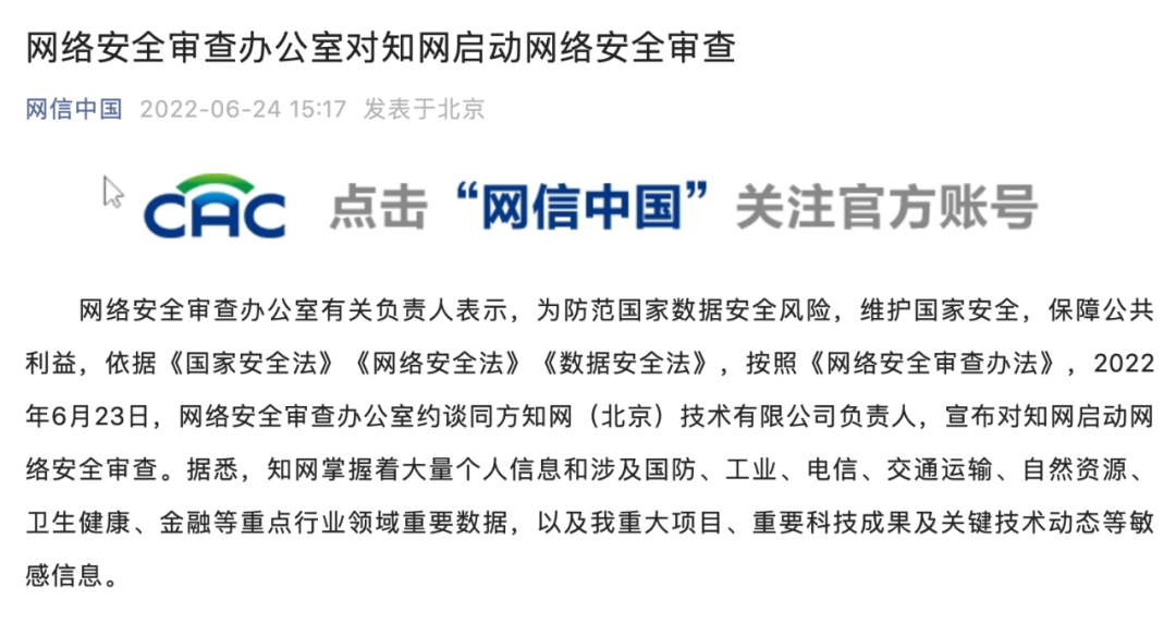 ![]() 网络安全审查办公室有关负责人表示,为防范国家数据安全风险,维护国家安全,保障公共利益,依据《国家安全法》《网络安全法》《数据安全法》,按照《网络安全审查办法》,2022年6月23日,网络安全审查办公室约谈同方知网(北京)技术有限公司负责人,宣布对知网启动网络安全审查。 据悉,知网掌握着大量个人信息和涉及国防、工业、电信、交通运输、自然资源、卫生健康、金融等重点行业领域重要数据,以及我重大项目、重要科技成果及关键技术动态等敏感信息。 ![]() 点击此处回顾九旬教授诉知网维权事件>>> 高考分数查询通道 ① 进入长江日报微信 ② 在首页下方对话框 输入“高考查分” 进入高考成绩查询页面 ![]() ![]() 推荐阅读