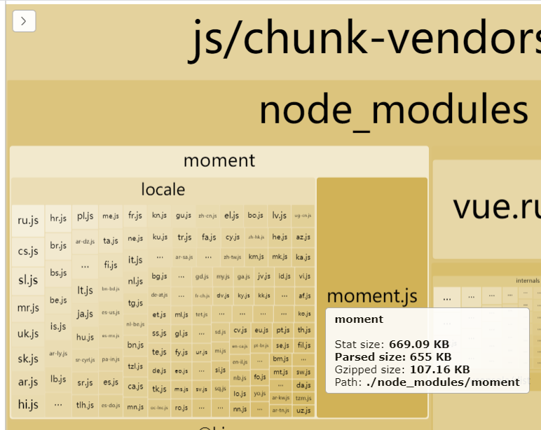 足足有600+K。 我们上传服务器的文件肯定是越小越好,所以需要按需导入,图中可以看到,Moment.js 里面大部分是各类语言包,我们日常使用肯定不需要这么多语言包,所以在Vue.config.js 中配置。 { const plugins = []; plugins.push( new webpack.ContextReplacementPlugin(/moment[/\\]locale$/, /zh-cn/) ); config.plugins = [...config.plugins, ...plugins]; }} 即可实现部分打包,效果出来是这样的