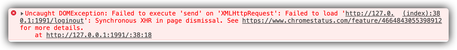 既然异步 Ajax 不行,那就试试同步的吧,结果直接报错了: 搜了一下,解释如下: Chrome now disallows synchronous XHR during page dismissal when the page is being navigated away from or closed by the user. This involves the following events (when fired on the path of page dismissal): beforeunload, unload, pagehide, and visibilitychange.