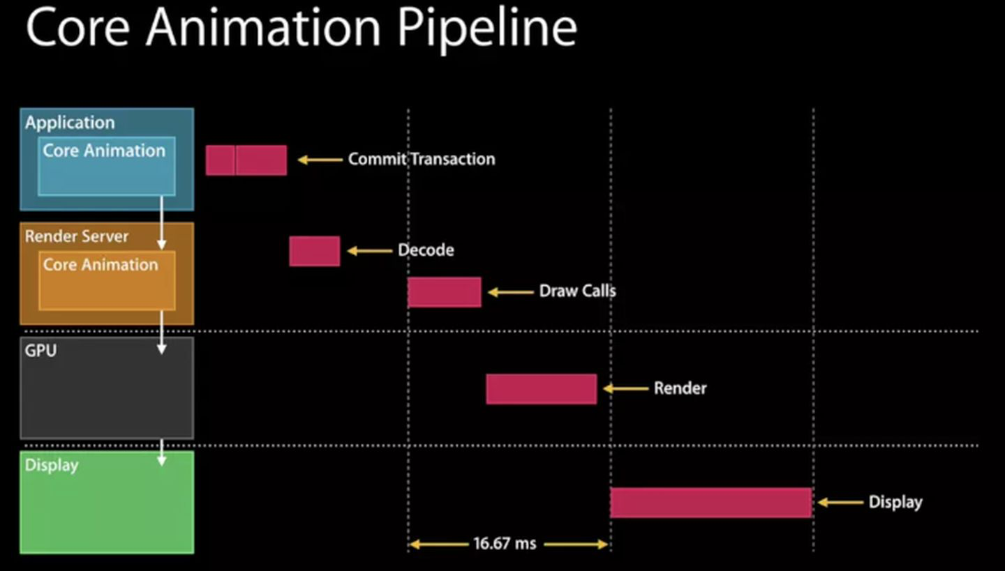 GPU 渲染机制:CPU计算好显示内容提交到GPU,GPU渲染完成后将渲染结果放入帧缓冲区frame buffer,随后视频控制器会按照VSync信号逐行读取帧缓冲区的数据,经过可能的数模转换传递给显示器显示。 GPU 屏幕渲染有以下两种方式: ● 1)On-Screen Rendering,意为当前屏幕渲染,指的是GPU的渲染操作是在当前用于显示的屏幕缓冲区中进行。 ● 2)Off-Screen Rendering,意为离屏渲染,指的是GPU在当前屏幕缓冲区以外新开辟一个缓冲区进行渲染操作。 特殊的离屏渲染:如果将不在GPU的当前屏幕缓冲区中进行的渲染都称为离屏渲染,那么就还有另一种特殊的“离屏渲染”方式:CPU渲染。如果我们重写了drawRect方法,并且使用任何Core Graphics的技术进行了绘制操作,就涉及到了CPU渲染。整个渲染过程由CPU在App内同步地完成,渲染得到的bitmap最后再交由GPU用于显示。备注:Core Graphics通常是线程安全的,所以可以进行异步绘制,显示的时候再放回主线程,一个简单的异步绘制过程大致如下: (void)display { dispatch_async(backgroundQueue, ^{ CGContextRef ctx = CGBitmapContextCreate(...); // draw in context... CGImageRef img = CGBitmapContextCreateImage(ctx); CFRelease(ctx); dispatch_async(mainQueue, ^{ layer.contents = img; }); });}