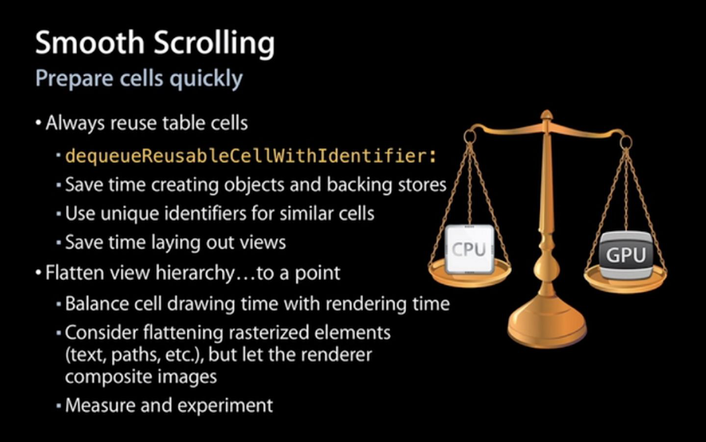 我们还可以通过设置shouldRasterize属性值为YES来强制开启离屏渲染。其实就是光栅化(Rasterization)。既然离屏渲染这么不好,为什么我们还要强制开启呢?当一个图像混合了多个图层,每次移动时,每一帧都要重新合成这些图层,十分消耗性能。当我们开启光栅化后,会在首次产生一个位图缓存,当再次使用时候就会复用这个缓存。但是如果图层发生改变的时候就会重新产生位图缓存。所以这个功能一般不能用于UITableViewCell中,cell的复用反而降低了性能。最好用于图层较多的静态内容的图形。而且产生的位图缓存的大小是有限制的,一般是2.5个屏幕尺寸。在100ms之内不使用这个缓存,缓存也会被删除。所以我们要根据使用场景而定。 3、其他的一些优化建议 ● 当我们需要圆角效果时,可以使用一张中间透明图片蒙上去 ● 使用ShadowPath指定layer阴影效果路径 ● 使用异步进行layer渲染(Facebook开源的异步绘制框架AsyncDisplayKit) ● 设置layer的opaque值为YES,减少复杂图层合成 ● 尽量使用不包含透明(alpha)通道的图片资源 ● 尽量设置layer的大小值为整形值 ● 直接让美工把图片切成圆角进行显示,这是效率最高的一种方案 ● 很多情况下用户上传图片进行显示,可以让服务端处理圆角 ● 使用代码手动生成圆角Image设置到要显示的View上,利用UIBezierPath(CoreGraphics框架)画出来圆角图片 青山不改,绿水长流!谢谢大家 免责声明:如果侵犯了您的权益,请联系站长,我们会及时删除侵权内容,谢谢合作! |