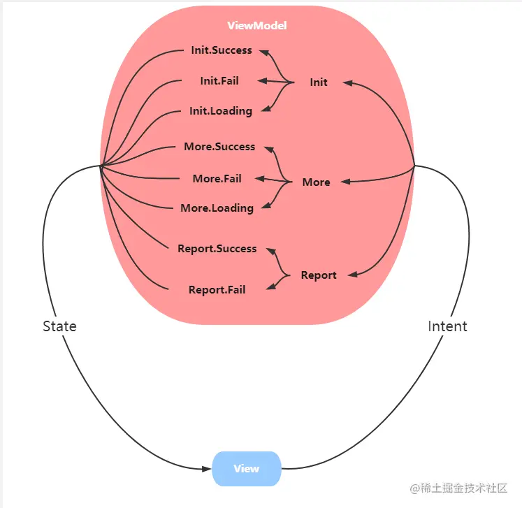 在 MVVM 中,这些行为被表达为 ViewModel 的一个方法调用。在 MVI 中被称为意图Intent,它们不再是一个方法调用,而是一个数据。通常可被这样定义: sealed class FeedsIntent { data class Init(val type: Int, val count: Int) : FeedsIntent() data class More(val timestamp: Long, val count: Int) : FeedsIntent() data class Report(val id: Long) : FeedsIntent()}