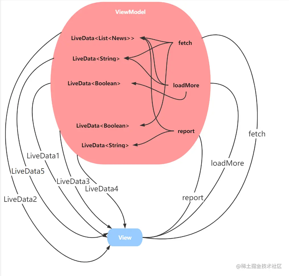 - ViewModel 内部请求和数据关系的复杂度:数据被定义为 ViewModel 的成员变量。成员变量是增加复杂度的利器,因为它可以被任何成员方法访问。也就是说,新增业务对成员变量的修改可能影响老业务的界面展示。同理,当界面展示出错时,也很难一下子定位到是哪个请求造成的。