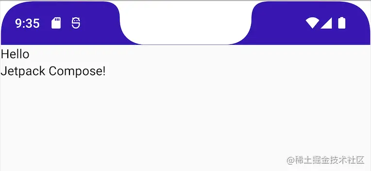 上面这段代码,即使你没有任何Compose基础,应该也可以轻松理解。Column相当于Android当中纵向的线性布局LinearLayout,在这个布局当中,我们放了两个Text控件。 最终的UI界面展示,如下图所示。 例子虽然简单,但是上面的代码中,还是有两个细节需要我们注意,我已经用注释标记出来了: 注释1,Greeting()它是一个Kotlin的函数,如果抛开它的@Composable注解不谈的话,那么,它的函数类型应该是() -> Unit。但是,由于@Composable是一个非常特殊的注解,Compose的编译器插件会把它当作影响函数类型的因子之一。所以,Greeting()它的函数类型应该是@Composable () -> Unit。(顺便提一句,另外两个常见的函数类型影响因子是:suspend、函数类型的接收者。) 注释2:Column {},请留意它的{},我们之所以可以这样写代码,这其实是Kotlin提供的高阶函数简写。它完整的写法应该是这样的: // 代码段2Column(content = { log(2) Text(text = "Hello") log(3) Text(text = "Jetpack Compose!")})