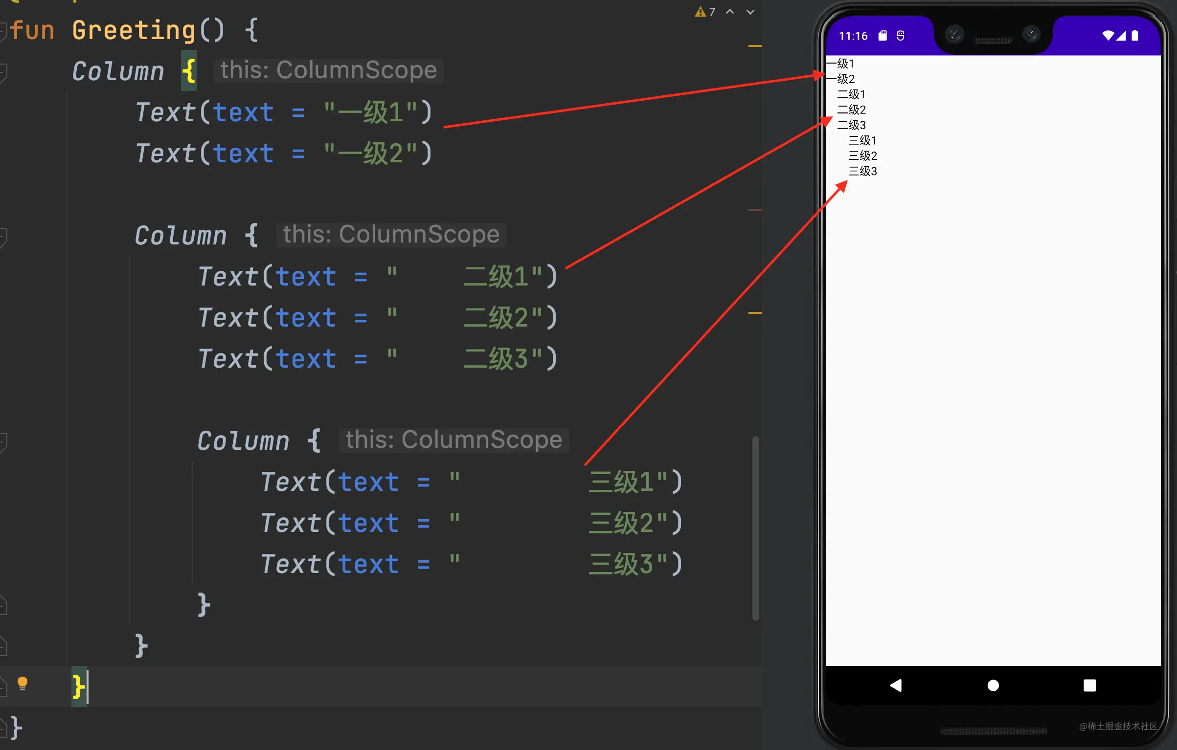 由此可见,Compose的语法,其实就是通过Kotlin的高阶函数实现的。Column()、Text()看起来像是在调用UI控件的构造函数,但它实际上只是一个普通的顶层函数,所以说,这只是一种DSL的“障眼法”而已。 备注:如果你想研究如何用Kotlin编写DSL,可以去看看我公众号的历史文章。