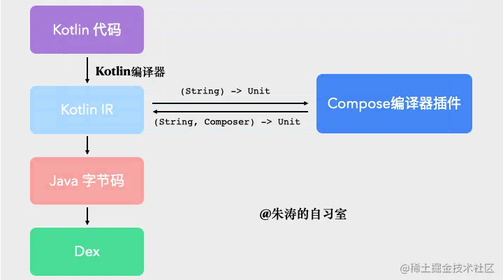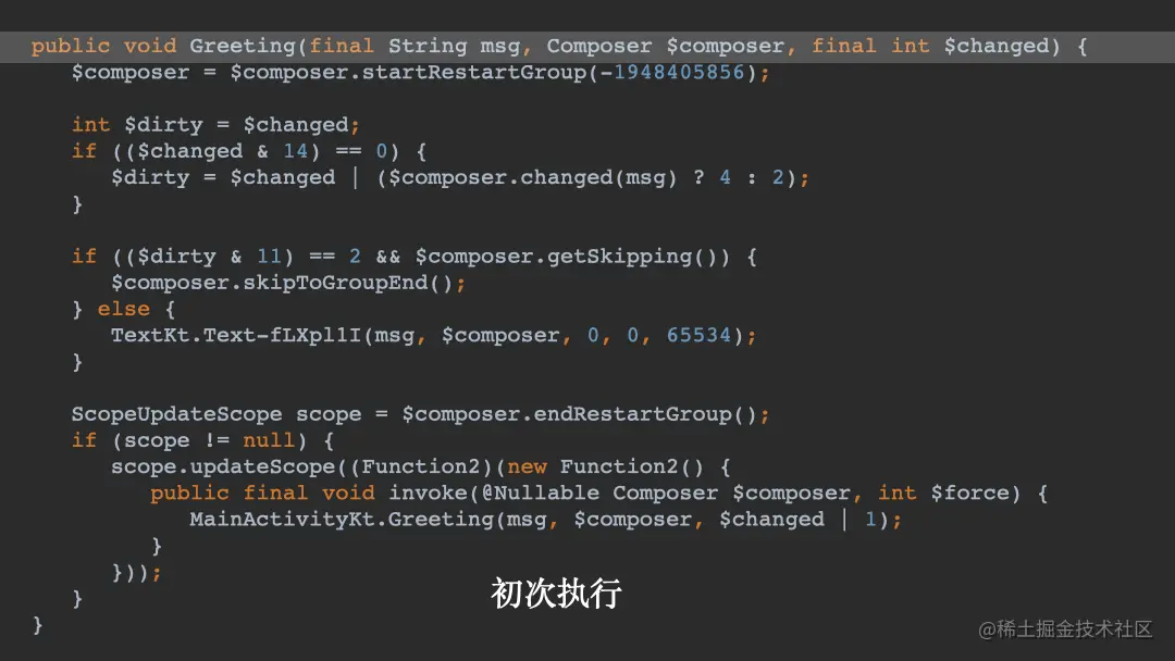 另外,由于Compose并不是属于Kotlin的范畴,为了实现Composable函数的转换,Compose团队是通过「Kotlin编译器插件」的形式来实现的。我们写出的Kotlin代码首先会被转换成IR,而Compose Compiler Plugin则是在这个阶段直接改变了它的结构,从而改变了最终输出的Java字节码以及Dex。这个过程,也就是我在文章开头放那张动图所描述的行为。 不过,Compose Compiler 不仅仅只是改变「函数签名」那么简单,如果你将Composable函数反编译成Java代码,你就会发现它的函数体也会发生改变。 让我们来看一个具体的例子,去发掘Compose的「重组」(Recompose)的实现原理。 四、Recompose 的原理// 代码段5class MainActivity : ComponentActivity() { // 省略 @Composable fun Greeting(msg: String) { Text(text = "Hello $msg!") }}