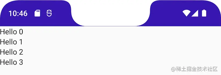 你看,Composable不仅从源码的角度上看是个普通的函数,它在运行时的行为模式,跟普通的函数也是类似的。我们写出来的Composable函数,它们互相嵌套,最终会形成一个树状结构,准确来说是一个N叉树。而Composable函数的执行顺序,其实就是对一个N叉树的DFS遍历。 这样一来,我们写出来的Compose UI就几乎是:“所见即所得”。 也许,你会觉得,上面这个例子,也不算什么,毕竟,XML也可以做到类似的事情。那么,让我们来看另外一个例子吧。 // 代码段4@Composablefun Greeting() { log("start") Column { repeat(4) { log("repeat $it") Text(text = "Hello $it") } } log("end")}// 输出结果:com.boycoder.testcompose D/MainActivity: startcom.boycoder.testcompose D/MainActivity: repeat 0com.boycoder.testcompose D/MainActivity: repeat 1com.boycoder.testcompose D/MainActivity: repeat 2com.boycoder.testcompose D/MainActivity: repeat 3com.boycoder.testcompose D/MainActivity: end