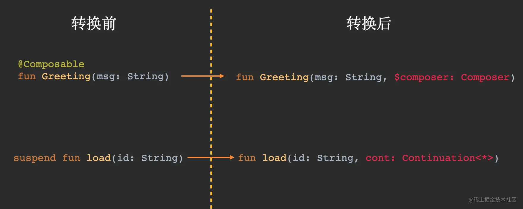 我们使用repeat{}重复调用了4次Text(),我们就成功在屏幕上创建了4个Text控件,最关键的是,它们还可以在Column{}当中正常纵向排列。这样的代码模式,在从前的XML时代是不可想象的。 话说回来,正是因为Composable的本质就是函数,它才会具备普通函数的一些特质,从而,也让我们可以像写普通代码一样,用逻辑语句来描述UI布局。 好了,现在我们已经知道了Composable的本质是函数,可是,我们手机屏幕上的那些UI控件是怎么出现的呢?接下来,我们需要再学「一点点」Compose编译器插件的知识。PS:这回,我保证真的是「一点点」。 三、Compose 编译器插件虽然Compose Compiler Plugin看起来像是一个非常高大上的东西,但从宏观概念上来看的话,它所做的事情还是很简单的。 如果你看过我的博客《图解协程原理》的话,你一定会知道,协程的suspend关键字,它可以改变函数的类型,Compose的注解@Composable也是类似的。总的来说,它们之间的对应关系是这样的: 具体来说,我们在Kotlin当中写的Composable函数、挂起函数,在经过编译器转换以后,都会被额外注入参数。对于挂起函数来说,它的参数列表会多出一个Continuation类型的参数;对于Composable函数,它的参数列表会多出一个Composer类型的参数。 为什么普通函数无法调用「挂起函数」和「Composable函数」,底层的原因就是:普通函数根本无法传入Continuation、Composer作为调用的参数。 注意:需要特殊说明的是,在许多场景下,Composable函数经过Compose Compiler Plugin转换后,其实还可能增加其他的参数。更加复杂的情况,我们留到后续的文章里再分析。