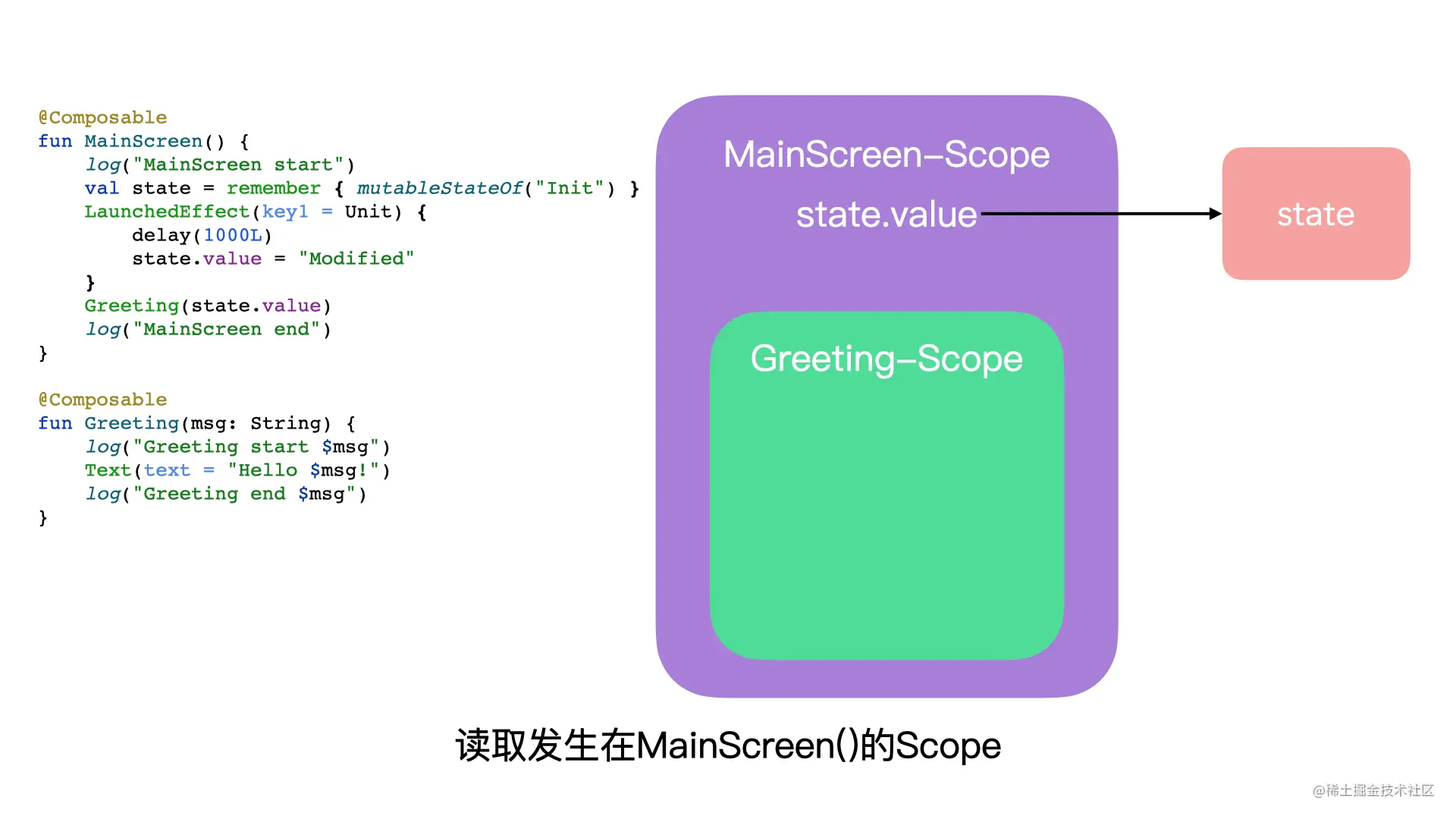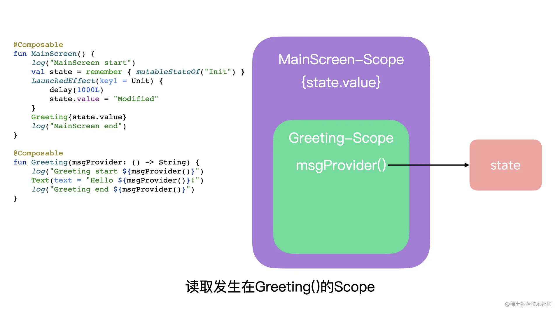 本质上,它其实就是通过自定义Getter、Setter来实现的。当我们定义的state变量,它的值从“Init”变为“Modified”的时候,Compose可以通过自定义的Setter捕获到这一行为,从而调用ScopeUpdateScope当中的监听,触发「重组」。 那么,代码段7、代码段8,它们之间的差异到底在哪里呢?关键其实就在于ScopeUpdateScope的不同。 这其中的关联,其实用一句话就可以总结:状态读取发生在哪个Scope,状态更新的时候,哪个Scope就发生重组。 如果你看不懂这句话也没关系,我画了一个图,描述了代码段7、代码段8之间的差异: 对于代码段7,当state的读取发生在MainScreen()的ScopeUpdateScope,那么,当state发生改变的时候,就会触发MainScreen()的Scope进行「重组」。 代码段8也是同理: 现在,回过头来看这句话,相信你就能看懂了:状态读取发生在哪个Scope,状态更新的时候,哪个Scope就发生重组。 好,做完前面这些铺垫以后,我们就可以轻松看懂Android官方给出的其中三条性能优化建议了。 - Defer reads as long as possible.