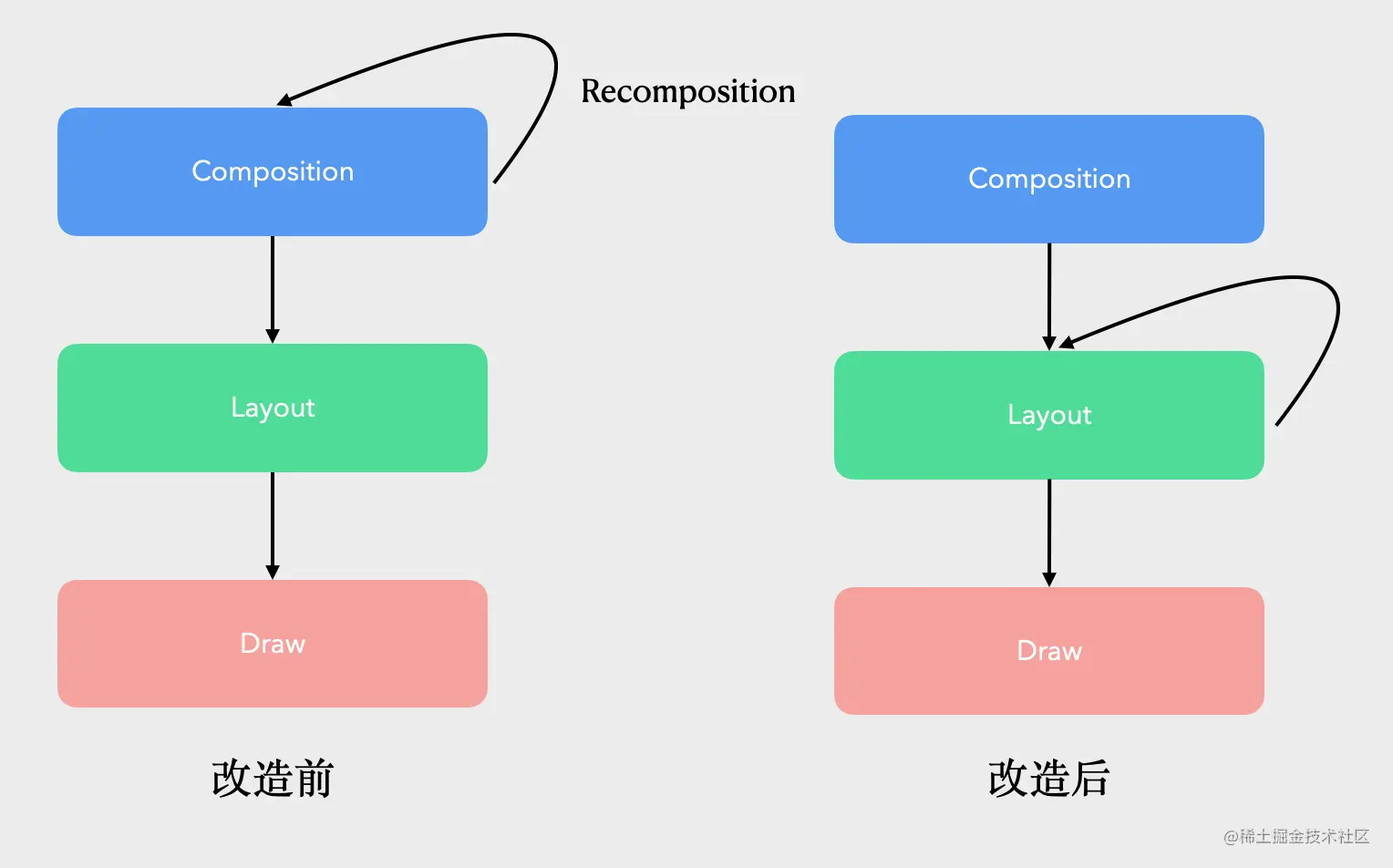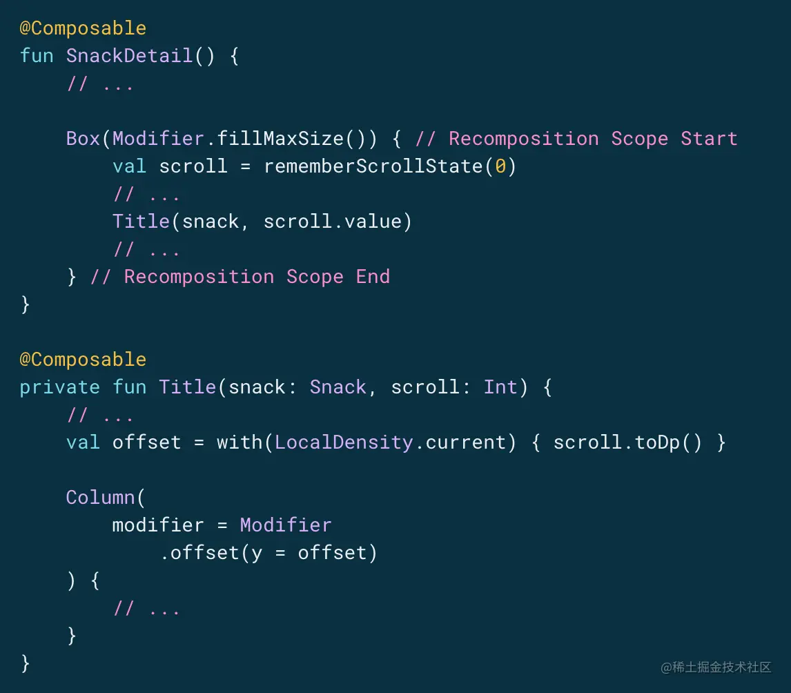总体的过程如下图所示: Android官方推荐我们尽可能推迟状态读取的原因,其实还是希望我们可以在某些场景下直接跳过Recomposition的阶段、甚至Layout的阶段,只影响到Draw。 而实现这一目标的手段,其实就是我们前面提到的「Laziness」思想。让我们以官方提供的代码为例: 首先,我要说明的是,Android官方文档当中的注释其实是存在一个小瑕疵的。它对新手友好,但容易对我们深入底层的人产生困扰。上面代码中描述的Recomposition Scope并不准确,它真正的Recomposition Scope,应该是整个SnackDetail(),而不是Box()。对此,我已经在Twitter与相关的Google工程师反馈了,对方也回复了我,这是“故意为之”的,因为这更容易理解。具体细节,你可以去这条Twitter看看。 好,我们回归正题,具体分析一下这个案例: // 代码段11@Composablefun SnackDetail() { // Recomposition Scope // ... Box(Modifier.fillMaxSize()) { Start val scroll = rememberScrollState(0) // ... Title(snack, scroll.value) // 1,状态读取 // ... } // Recomposition Scope End}@Composableprivate fun Title(snack: Snack, scroll: Int) { // ... val offset = with(LocalDensity.current) { scroll.toDp() } Column( modifier = Modifier .offset(y = offset) // 2,状态使用 ) { // ... }}