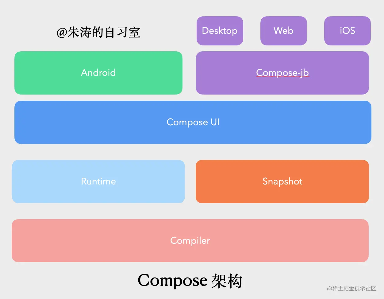 七、结束语其实,Compose的原理还是相当复杂的。它除了UI层跟Android有较强的关联以外,其他的部分Compiler、Runtime、Snapshot都是可以独立于Android以外而存在的。这也是为什么JetBrains可以基于Jetpack Compose构建出Compose-jb的原因。 这篇文章是「沉思录」系列的第二篇文章,后续除了Compose以后,还会有《Kotlin Jetpack 实战》系列,敬请期待。 作者:朱涛的自习室 链接:https://juejin.cn/post/7103336251645755429