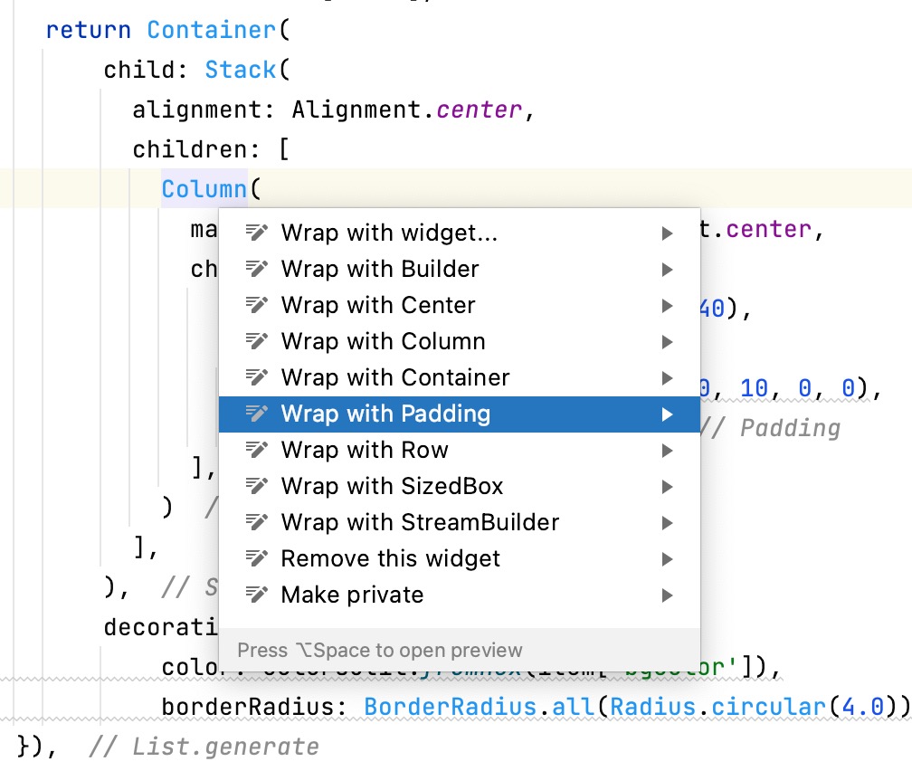 目前Flutter是当下最为热门的跨平台开发框架,Flutter的组件非常的多,有几百个,我们不可能都熟悉了之后再去写项目,我一般学习新的技术或者学习,花1个小时学习一下基本语法,然后从编写UI开始,再学习使用一些第三方库,基本上就能上手了,今天总结一下Flutter上开发UI的几种重要技巧 Flutter核心主要几种组件: 1、Scaffold定义了一个 UI 框架,这个框架包含 头部导航栏,body,右下角浮动按钮,底部导航栏等; 2、Container在Flutter中用的非常多,两个重要属性:constraints(边界约束),decoration:背景、边框、圆角、阴影等; 3、Padding在Flutter中也是一个组件,可以单独作为父组件来设置; 4、Row和Column是通过设置多个child来决定子组件是水平布局还是垂直布局 5、Stack是层叠布局,在iOS是通过frame来设置位置,与Android中FrameLayout类似,默认在左上角位置,Positioned(top:200,right:100来设置位置; 6、CustomScrollView、ListView、GridView是非常常见的界面主组件的,几乎每个界面都会被这三个组件来嵌套; 小技巧:因为Flutter的嵌套的写法一开始会非常不适应,往往会要在当前组件再去用一个组件作为父组件,在AndroidStudio中有一个快捷操作,按Alt+Enter,会有一个快速插入父组件的操作,如图常见的布局组件: ![]() 免责声明:如果侵犯了您的权益,请联系站长,我们会及时删除侵权内容,谢谢合作! |