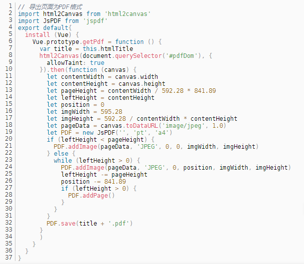 vue导出pdf文件方法:html2canvas+jspdf第一步:安装![]() 第二步:定义全局函数创建一个htmlToPdf.js文件在指定位置。我个人习惯放在src/components/utils/htmlToPdf ![]() 在main.js中使用我们定义的函数文件![]() 在需要的导出的页面…调用我们的getPdf方法即可![]() 直接在data中写入htmlTitle即可![]() 效果图![]() 优点:完美的呈现页面样式效果,无论是外联css还是组件内部的css均有效果。 缺点:外链图片不能使用,会报错;不够清晰 原文链接:https://blog.csdn.net/weixin_45031595/article/details/107545937 免责声明:如果侵犯了您的权益,请联系站长,我们会及时删除侵权内容,谢谢合作! |