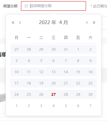 const disabledDate = (time: Date) => { let point = Date.now() + (3600 * 24 * 1000 * parseInt(state.statPrice.max_delivery_days_num)) // time.getTime()是每天凌晨的时间戳 // 小于时间点point 就禁选 return time.getTime() <= point}state.statPrice.max_delivery_days_num = 3时的效果