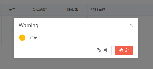 ElMessageBox.confirm( '确定要添加此物料吗', '提示', { confirmButtonText: '确定', cancelButtonText: '取消', type: 'warning', } ) .then(() => { console.log('点击确定') }) .catch(() => { console.log('点击取消') })弹窗输入